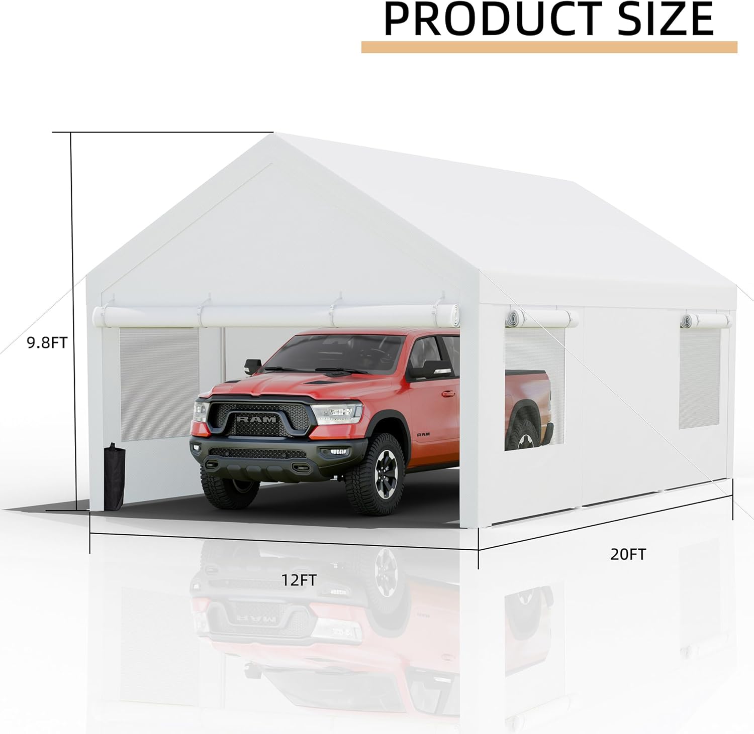 JY QAQA Carport, 12x20 FT Heavy Duty Carport Reinforced Steel Poles with Removable Sidewalls & Doors,Roll-up Windows Car Canopy with Sandbags and All-Season Tarp for Car Boat Truck Motorcycle