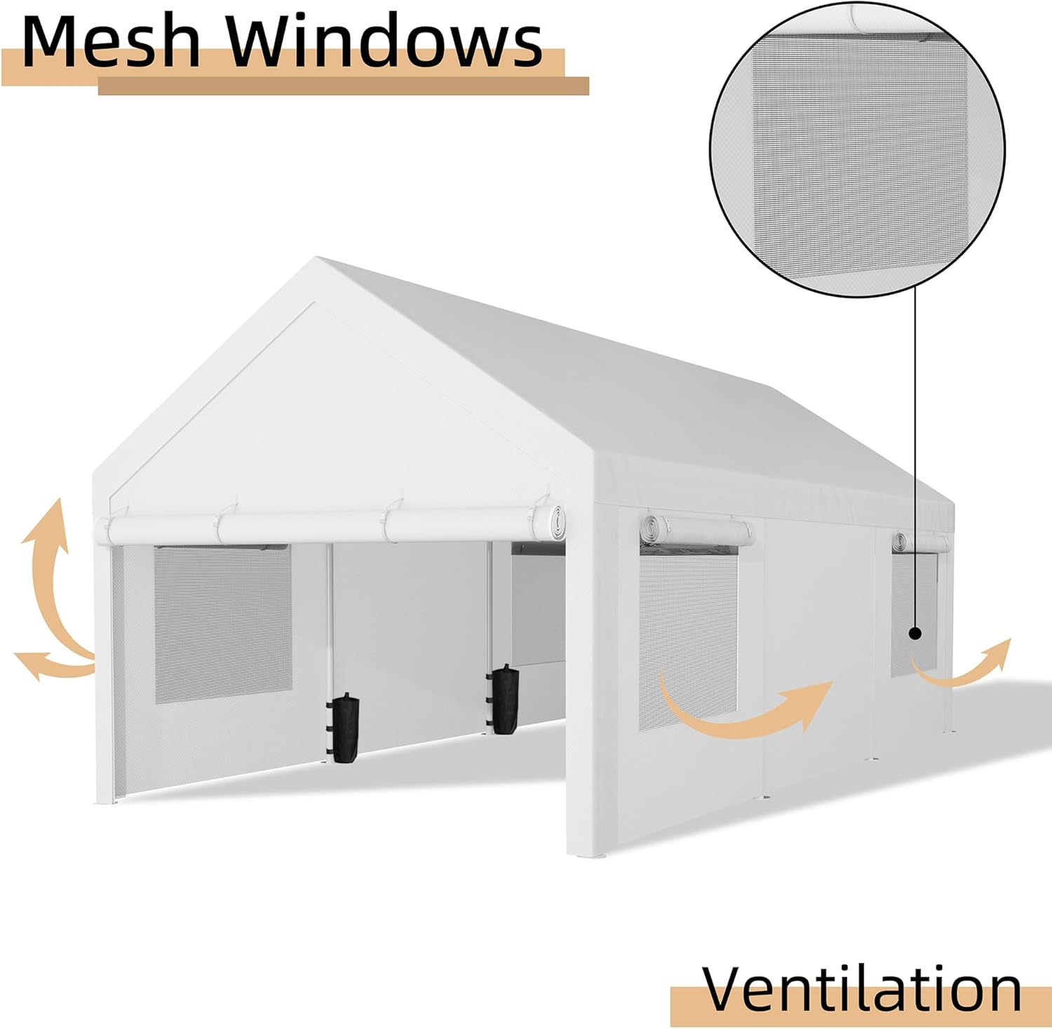 - Roll-up Windows: The carport features roll-up windows that offer excellent ventilation and natural light, creating a comfortable environment for your vehicles or activities.
