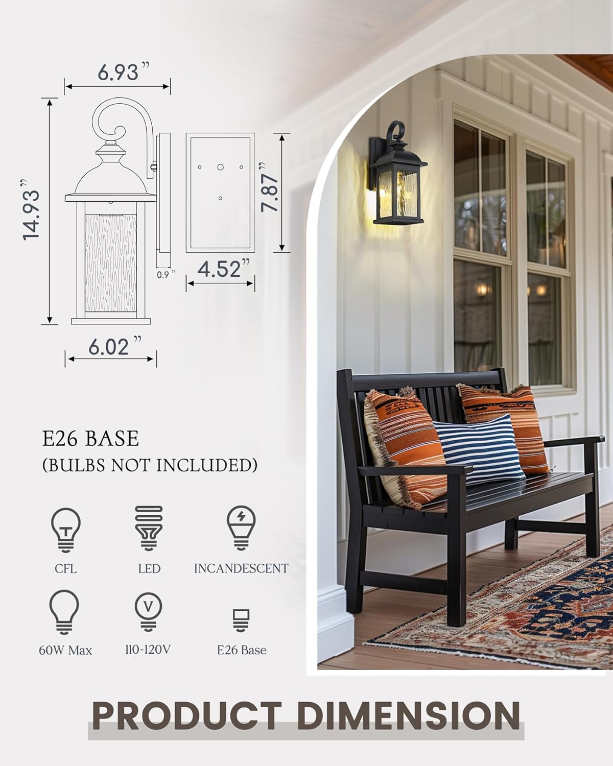 - 【Bulb Requirements】The package does not include bulbs. Our outdoor wall light fixture requires E26 base bulbs (Max 60W each), supporting any LED, CFL, or Edison bulbs for versatile lighting options.