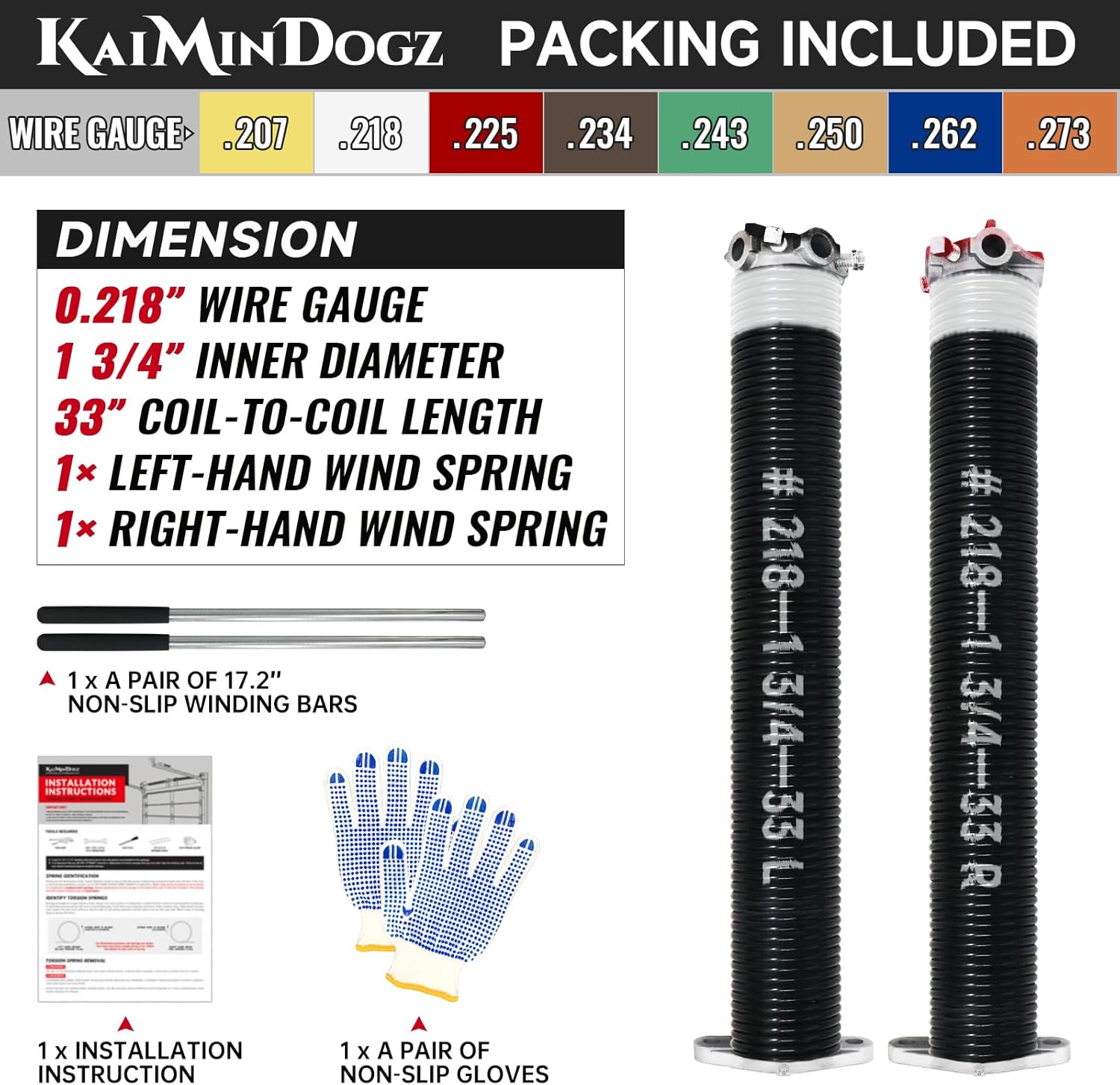 - PACKING INCLUDED : A pair of Garage Door Torsion Spring, A pair of 17.2’’ Non-Slip Winding Bars and Gloves, and Installation Instructions are included in the package, so you can start installing immediately after receiving the product.