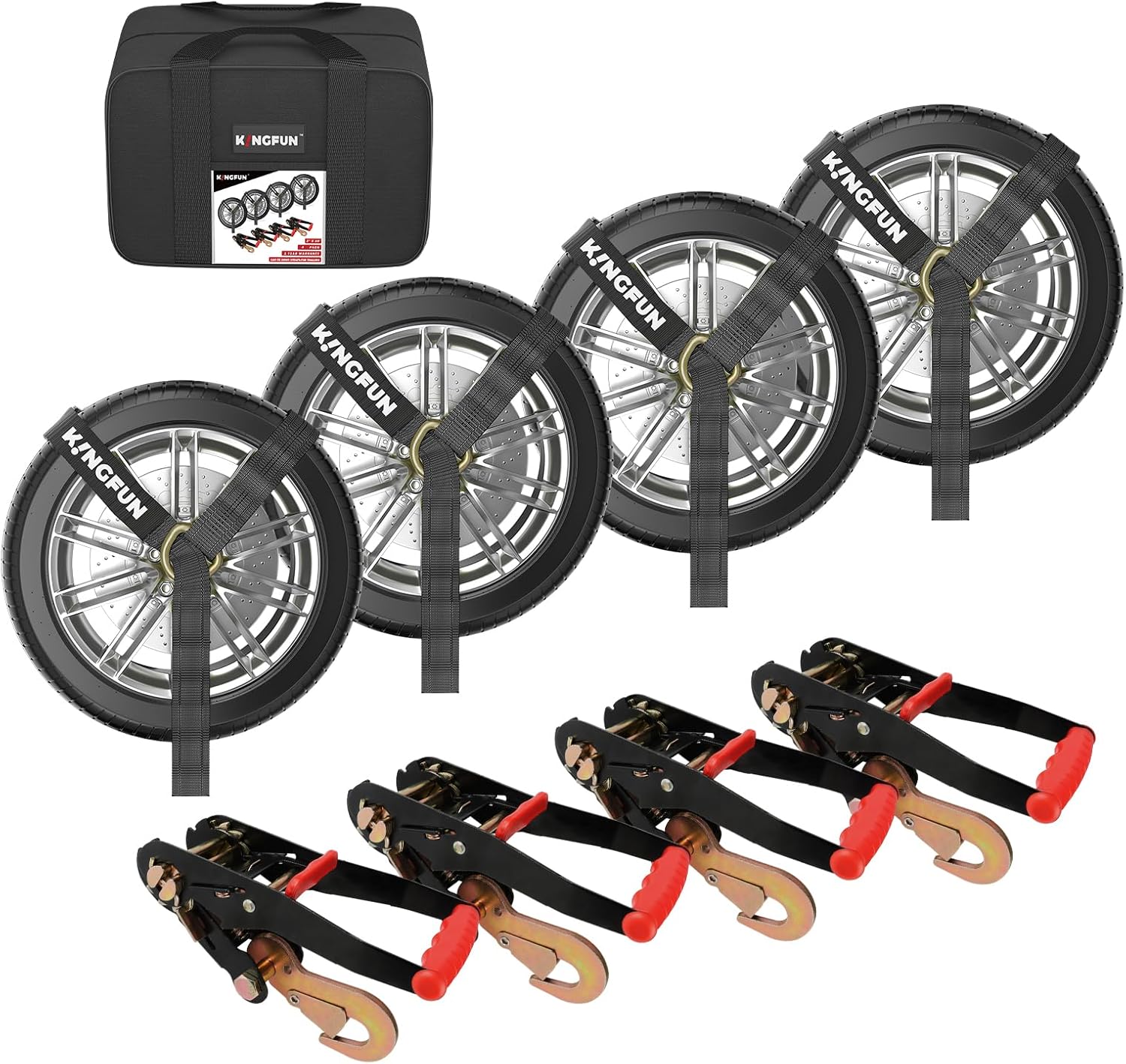 - APPLY TO MOST TIRES: Kingfun car tie down straps for trailers use to go through the rims of the transported vehicle, 4 pack 2" X 120" tire straps for a car trailer can use wheel, axle or frame. perfect for car ratchet straps trailer tie down, truck straps, SUV, cargo, motorcycle tie down straps to any trailer or flatbeds