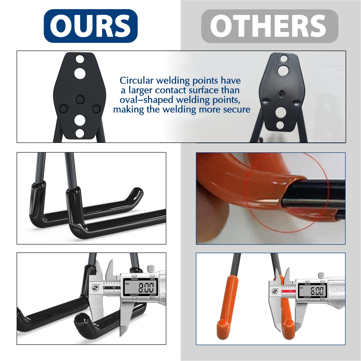 - Upgrade Design for Garage Hanging Hooks: Different from other similar garage hooks heavy duty with oval-shaped welding points, our designed circular welding points. These provide a larger contact surface between the hook and the backboard, offering higher security. With this design, thereβs no need to worry about the rear steel panel splitting or falling off, a perfect choice of wall hooks for hanging heavy duty