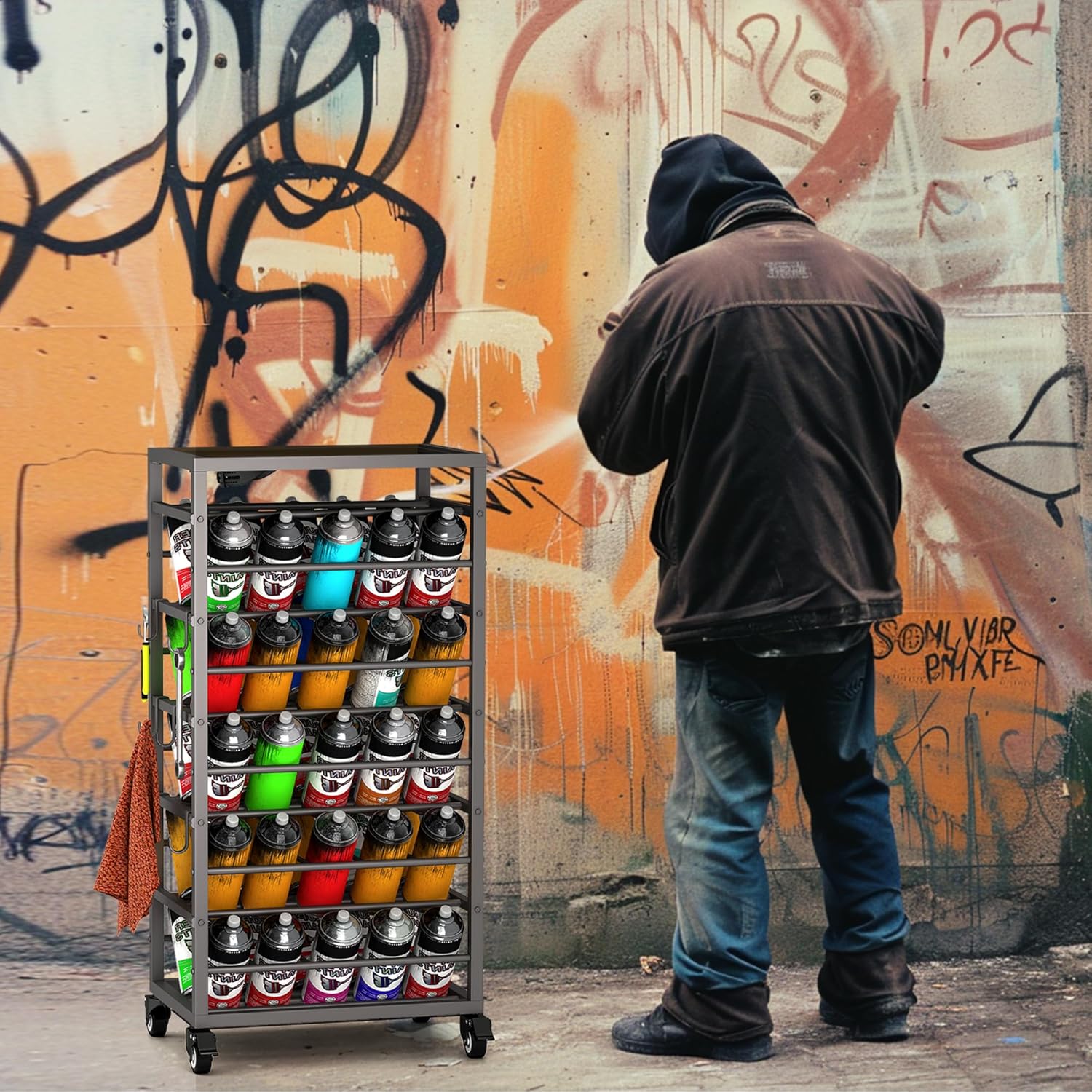 - ULTRAl-LARGE CAPACITY: Gtouse spray paint rack can accommodate up to 50 spray cans or lube cans. It uses a unique double -sided storage design and can store spray can on both sides. The top storage tray can accommodate garage tools such as spray paint helmet, and is equipped with 6 metals hooks for hanging items
