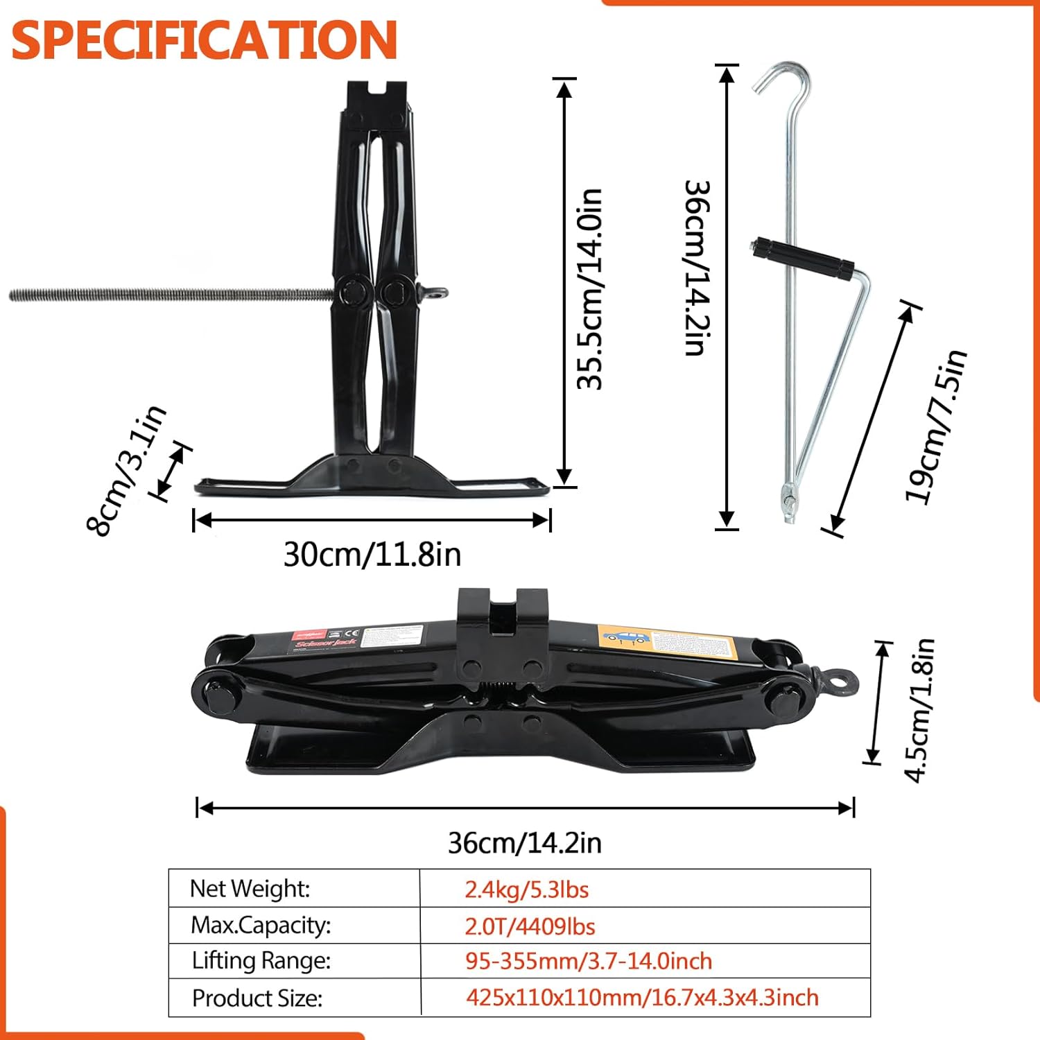 - 4.[Scissor Jack with hand crank]: Flexible Hand crank. Effortlessly power your scissor lift jacks with our convenient hand crank and a smooth spindle - featuring a durable hook, comfortable grip, and adjustable angle for convenience