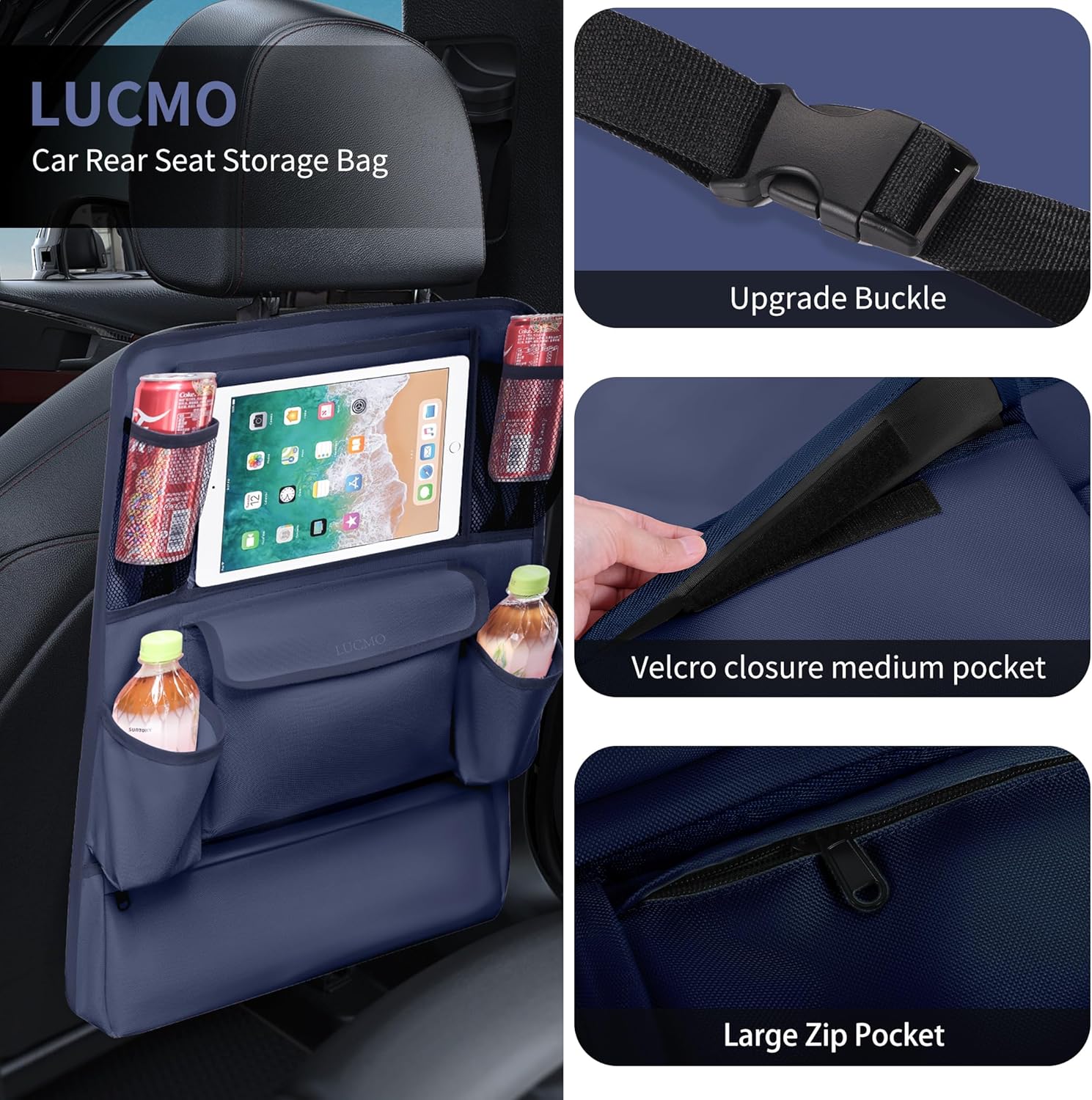 - 【Premium Material】LUCMO car seat organizer is made of high quality polyester with perfect waterproof property and good durability. Making your car looks very luxurious! Besides, it protects the back of your car seat from dust, abrasion and kicking dirts.