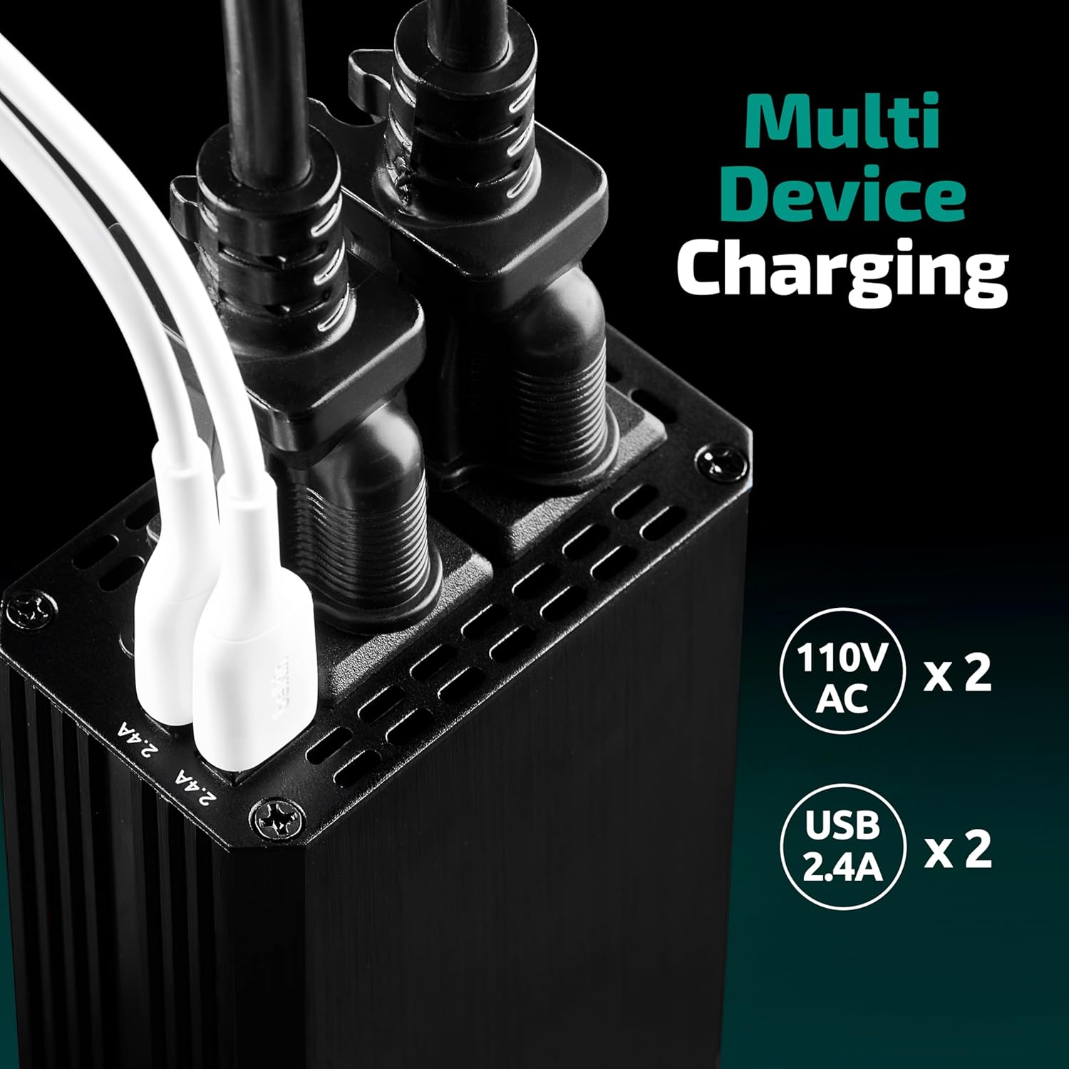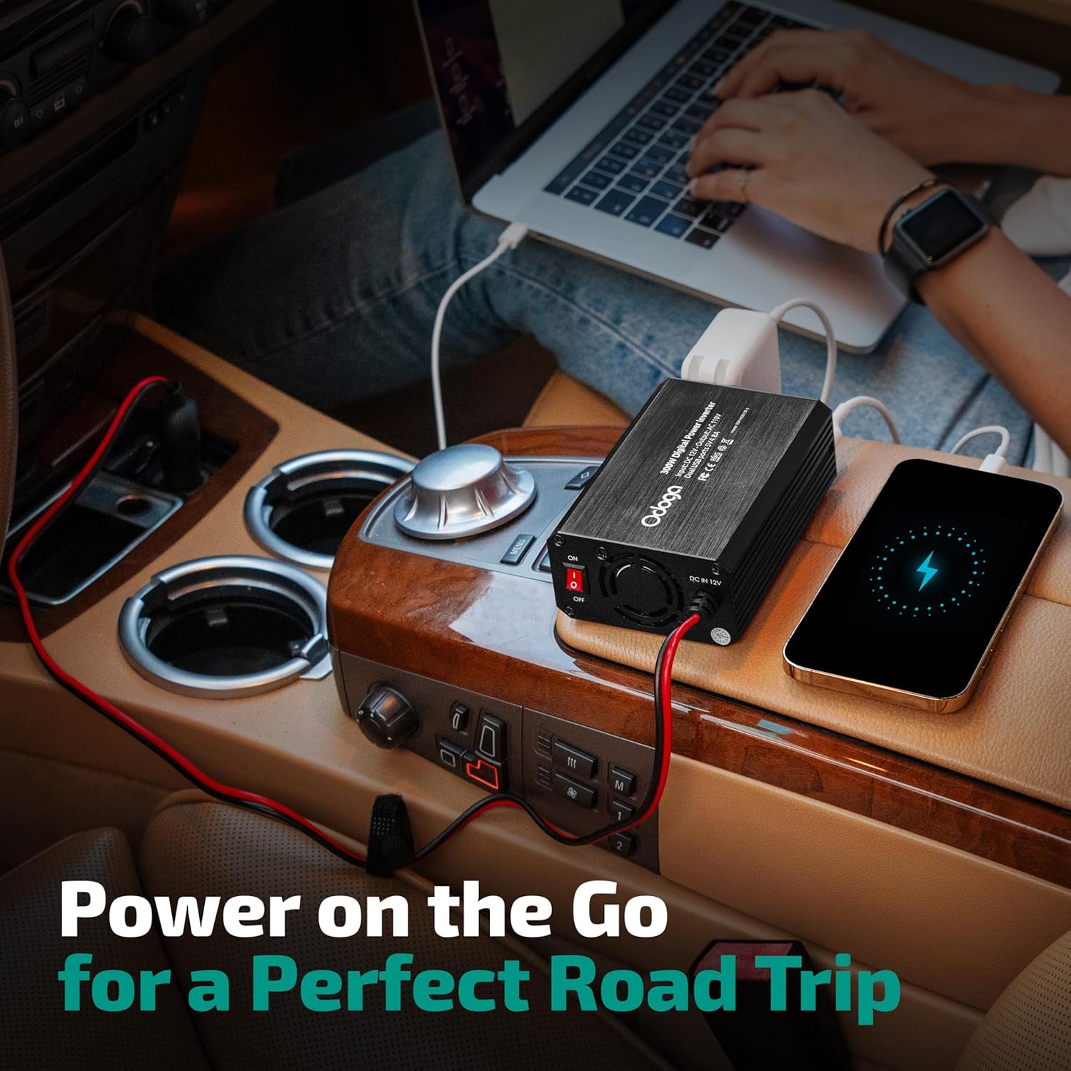 - POWER UP ON-THE-GO: This car power inverter delivers 300W continuous power with 2 USB ports and 2 AC outlets, perfect for charging laptop, phones & other devices on road trips, camping, business traveling.