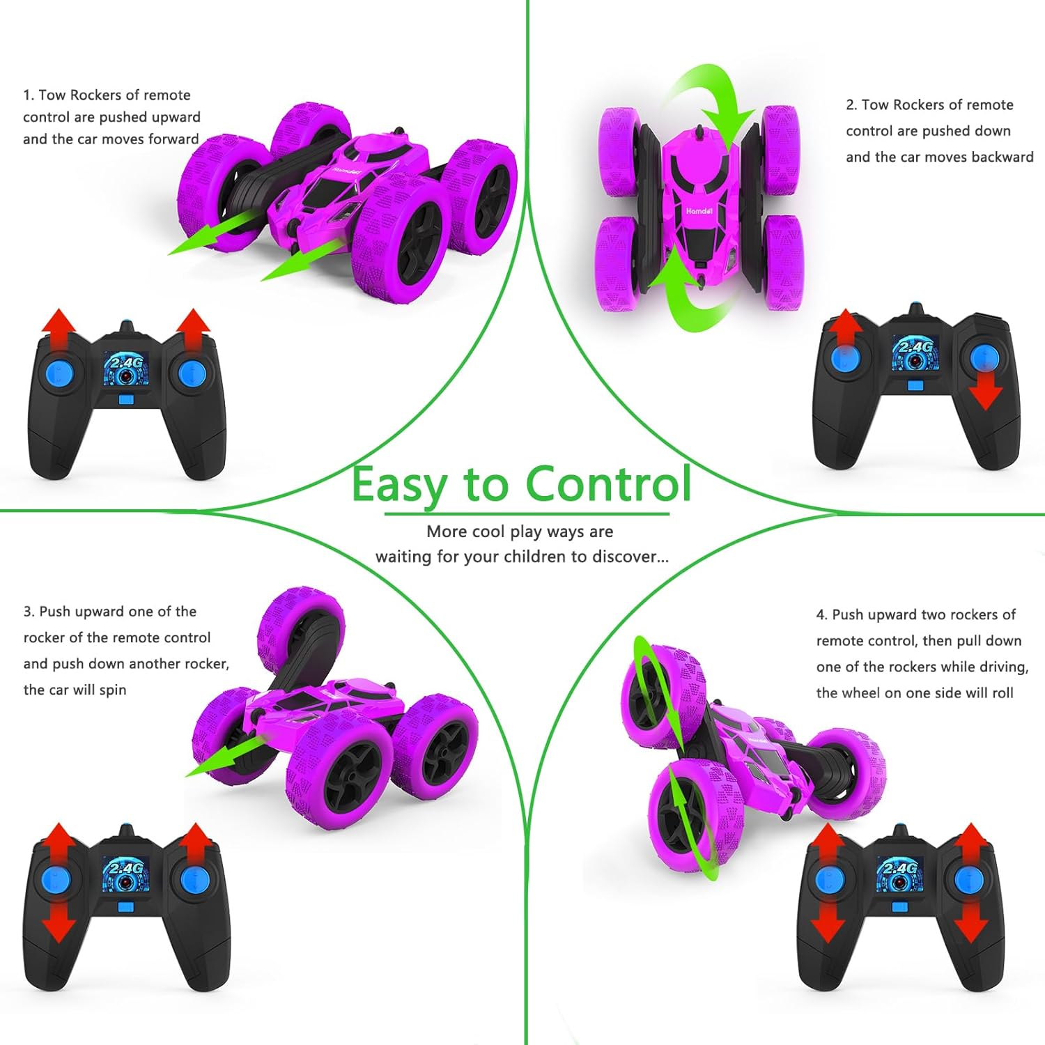 - Multiple Cars Playing at The Same Time: With 2.4GHz anti-interference frequency technology, multiple RC stunt cars can race simultaneously. The cool remote control can reach a maximum distance of 164 ft