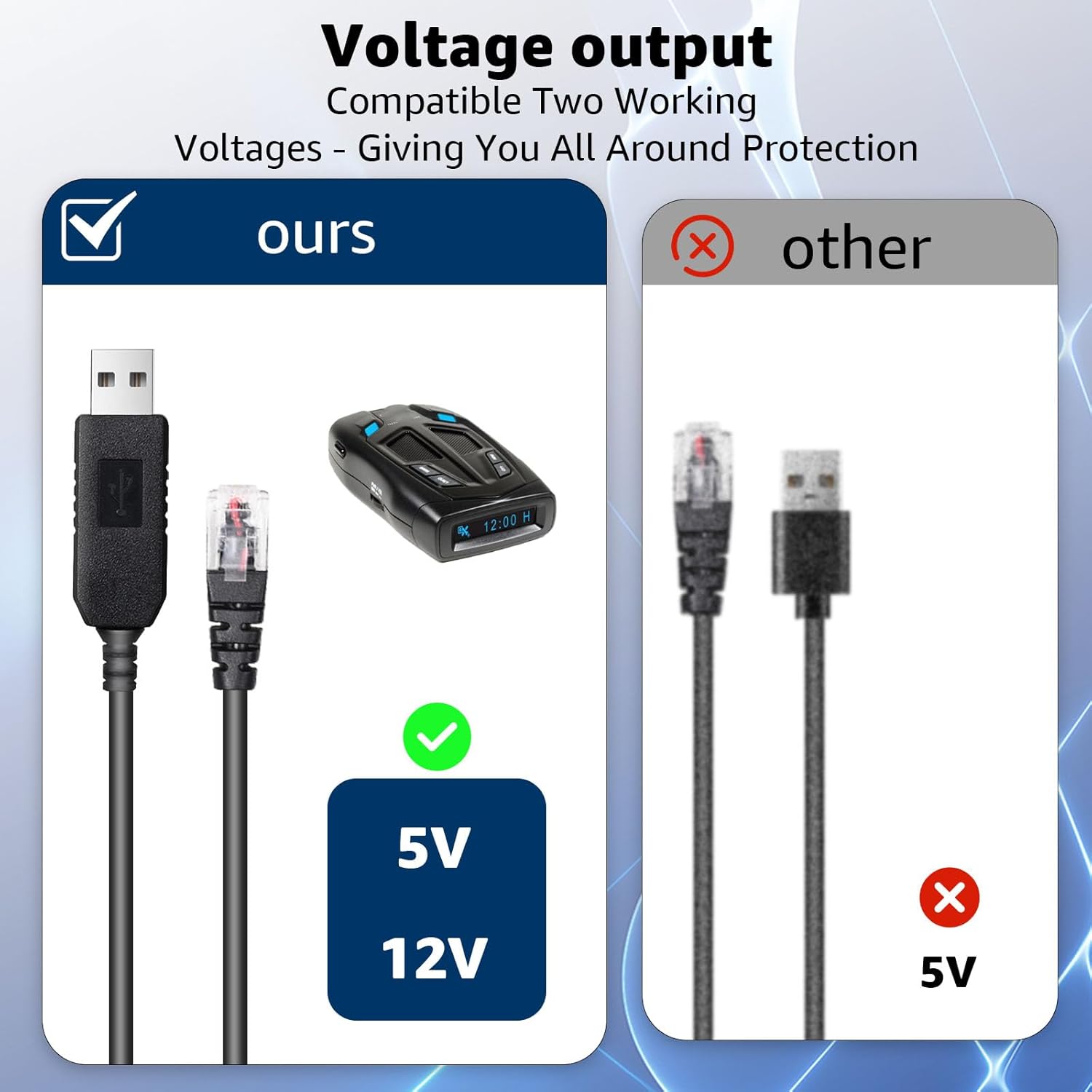 - Innovative Dual Voltage Technology:Hodeoo radar detector connectivity with our USB to RJ11 cable.Unlike conventional USB cables, ours seamlessly adapts to the varying voltage requirements of most radar detectors, eliminating compatibility issues and ensuring your device starts up every time.Effortlessly switch USB ports without disrupting your radar detector's operation;