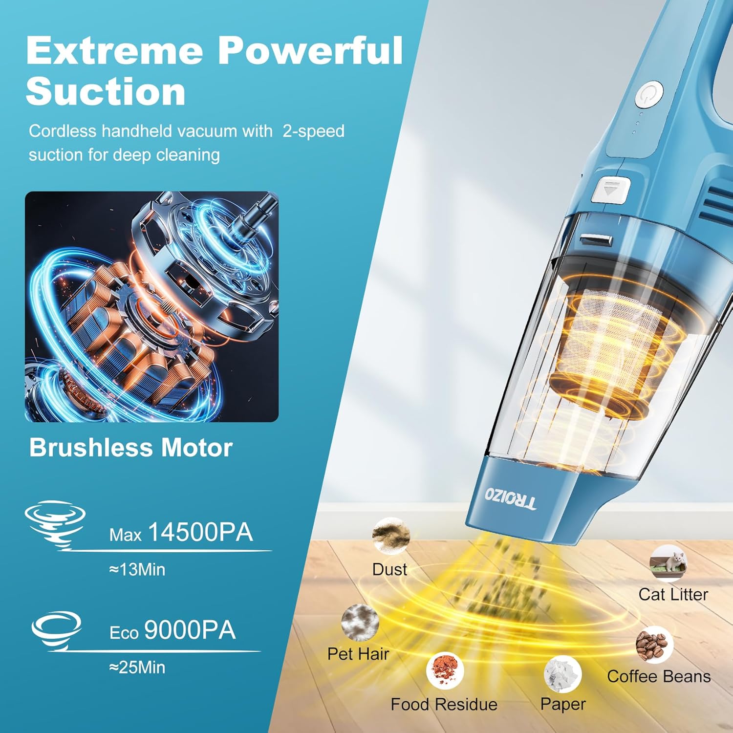 Handheld Vacuum Cordless, 14500PA Powerful Suction Hand Held Vacuum Cleaner with Brushless Motor, Rechargeable and Portable Car Vacuum Cleaner with Multi Accessories for Home Office Car Pet