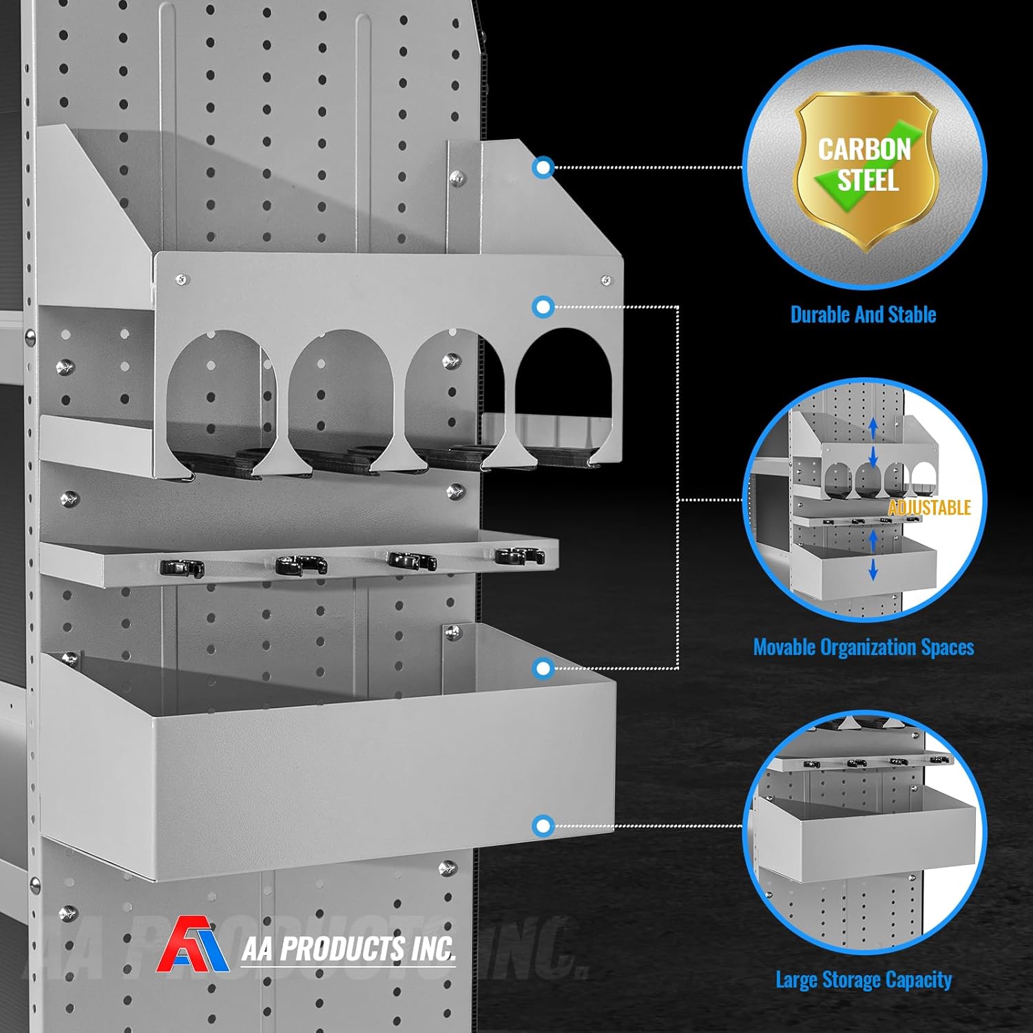 - AA power tool storage organizer can be mounted on a tool box, cart or wall, especially designed for 16” D AA van shelving storage racks.