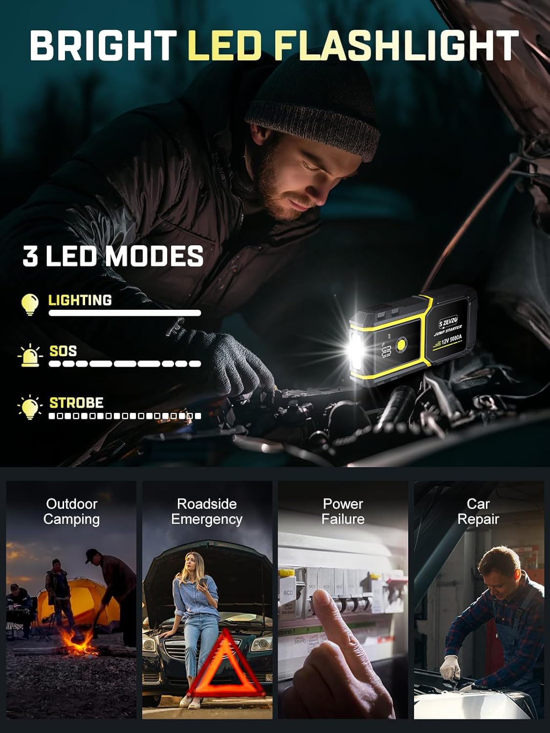 S ZEVZO H021 Car Jump Starter, Peak 5000A Jump Starter Battery Pack for Up to 10.0L Gas and 8.0L Diesel Engines, 12V Portable Jump Box with LCD Display, 3 Modes Flashlight and Protective Carrying Case