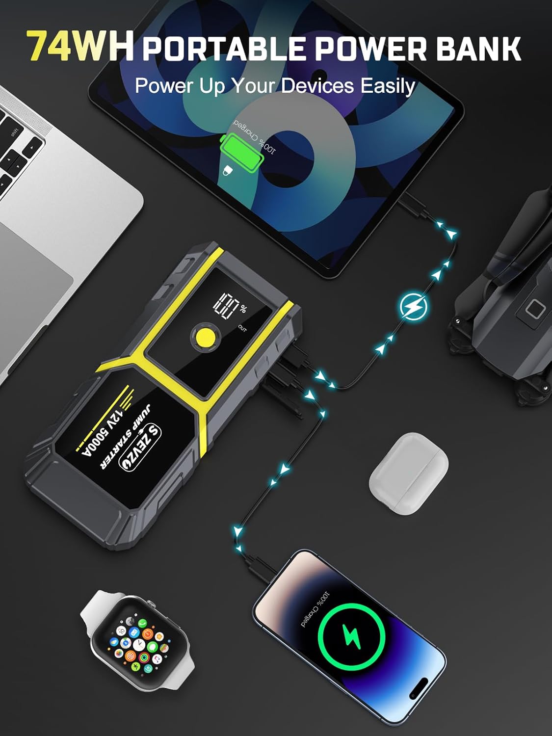 - 74Wh Portable Power Bank: This portable jump box also has a battery capacity of 74Wh that can be used as a backup power bank to charge your phones, tablets, and other USB port digital devices. It is designed with two USB outputs (5V/3A) and (5V/2.1A) that can be applied simultaneously for charging, 50% faster than a standard charger.