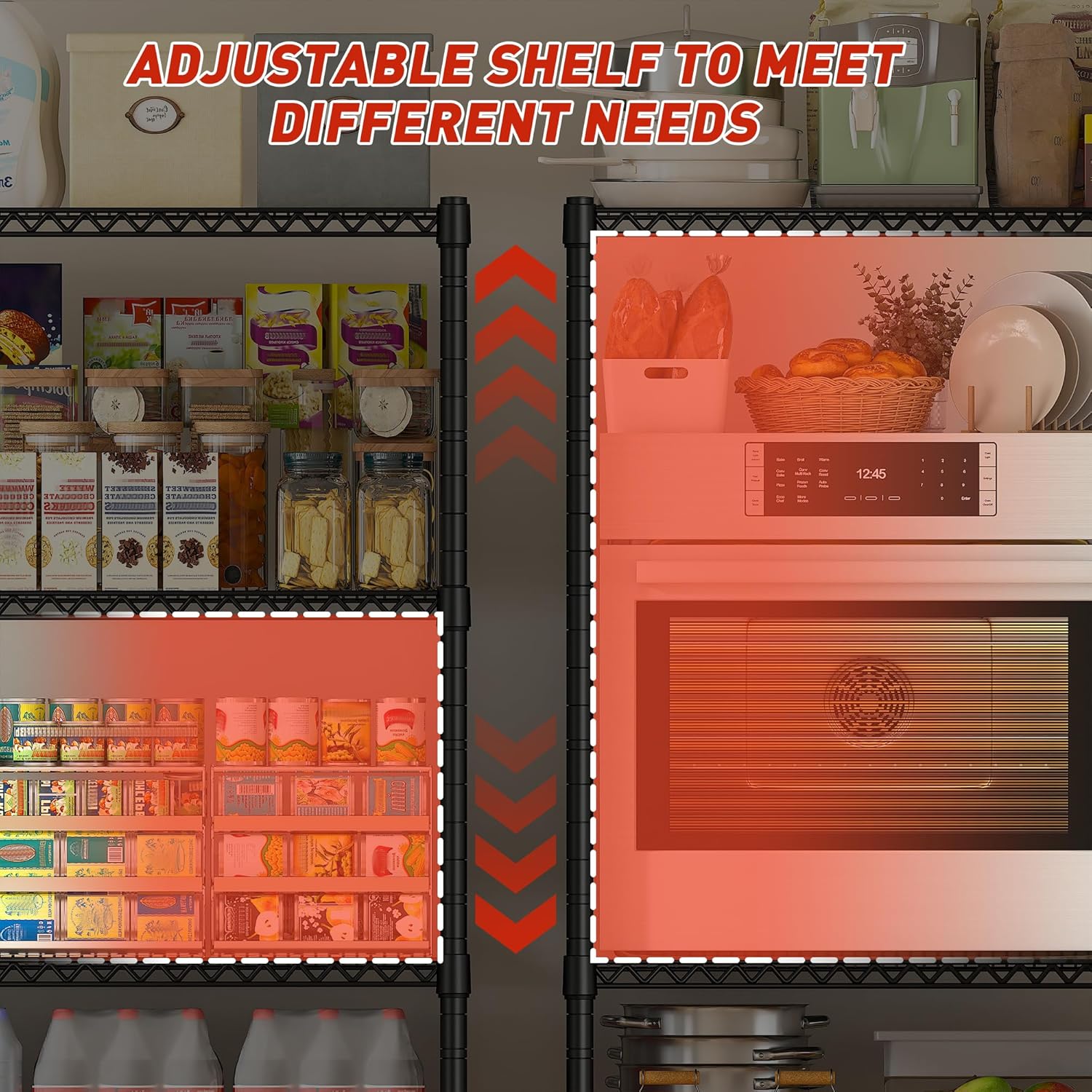 - ă60"W Metal Shelving UnităThe garage shelving measure 60"W x 18"D x 65.5"H. The capacity of the shelf is twice as much as the pantry shelves, easily meet your storage needs. Also perfect for various spaces such as garage, pantry room, kitchen, living room, office, warehouse, commercial exhibition, hotel, supermarket, etc.