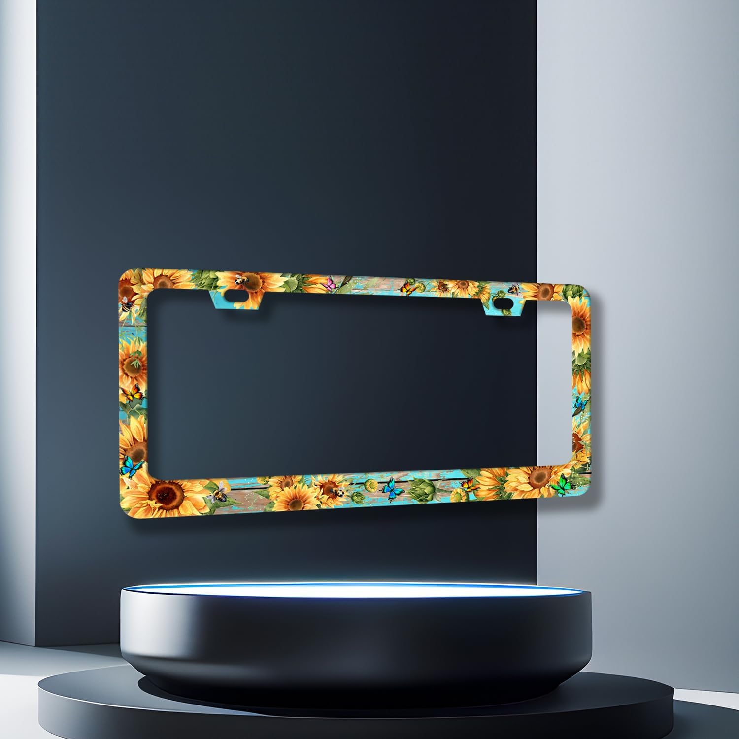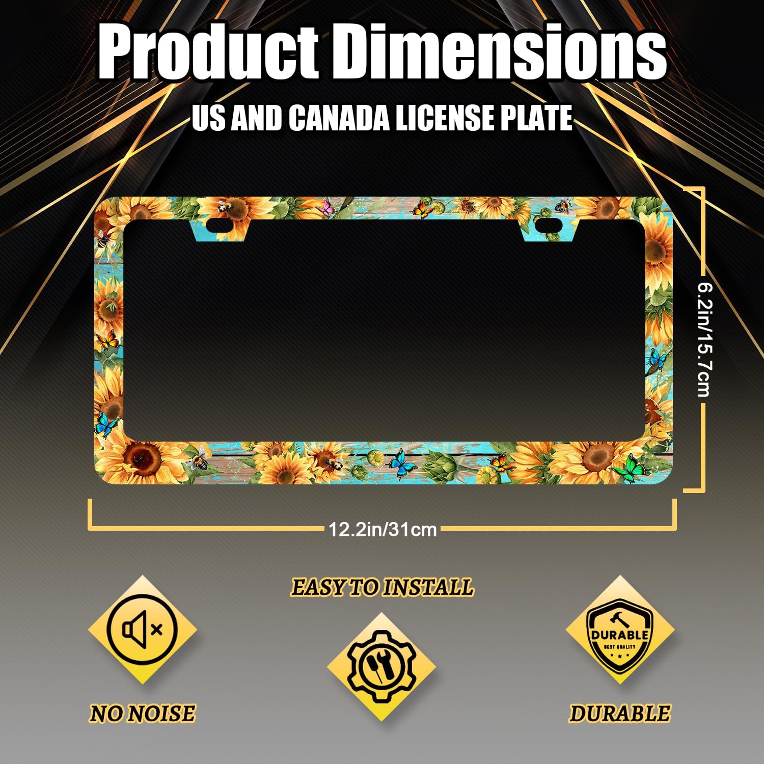 Butterfly Sunflower License Plate Frame Wooden Board Flowers Animals License Plate Holder Stainless Steel Front and Rear Car Tags Auto Parts Colorful License Plate Decoration with Screws 12.2" x 6.2"
