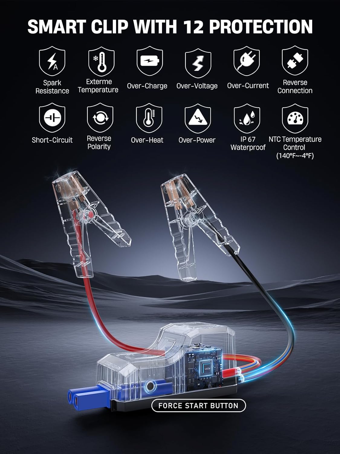 - ใ ๐.๐-๐๐๐๐ ๐๐๐ซ๐๐๐ง ๐๐๐๐๐๐๐ & ๐๐ ๐๐๐ ๐๐๐ ๐๐๐๐๐๐๐๐๐๐๐ ใ 2.7" LCD screen, easy to use, the battery level, mis-operation indication, inflator mode, real-time tire pressure at a glance. The jumper box for car battery portable is 100% safe, 12 types of protections include spark-proof and reverse polarity protection without worrying about incorrect connections or sparks.The shell of the product is PC+ABS, which is a V0-grade fire-retardant material. At the same time, the compact product structure gives this product an IP64 waterproof rating.