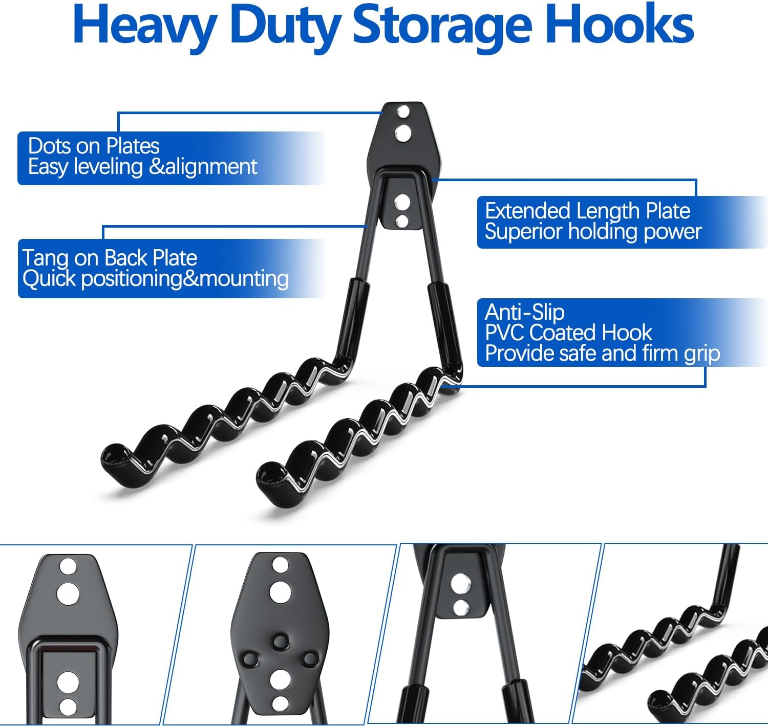 - SUPER STUDY HOOKS:The garage hooks for hanging are made of heavy duty steel metal material, have strong load bearing capacity which enable the garage storage system hooks can hold weight up to 100 lbs. The garage storage hooks are not easy to bend and will last for years. The tubular double hooks design makes ladder hooks for garage more stable than regular single hooks. Solid steel body adopts anti-rust coating and non-slip PVC sheath which gives storage hooks for garage wall better grab.