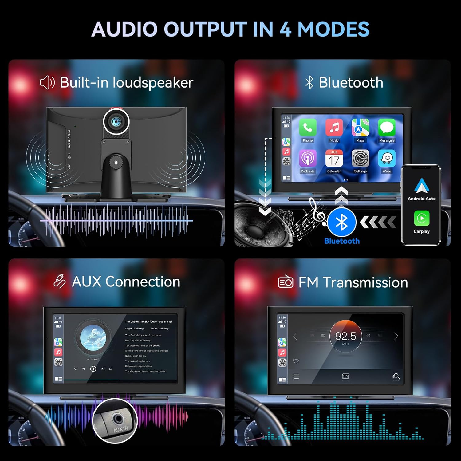- 4 Audio output modes and split screen--Except for the built-in speaker of the portable screen, there are 3 other audio modes for sound output: Aux cable, FM transmitter, Bluetooth, to fit in different cars, allowing you to seamlessly connect to your vehicle's speaker for a high-quality car audio experience. The devce also supports Split Screen function to enjoy two interfaces at the same time.
