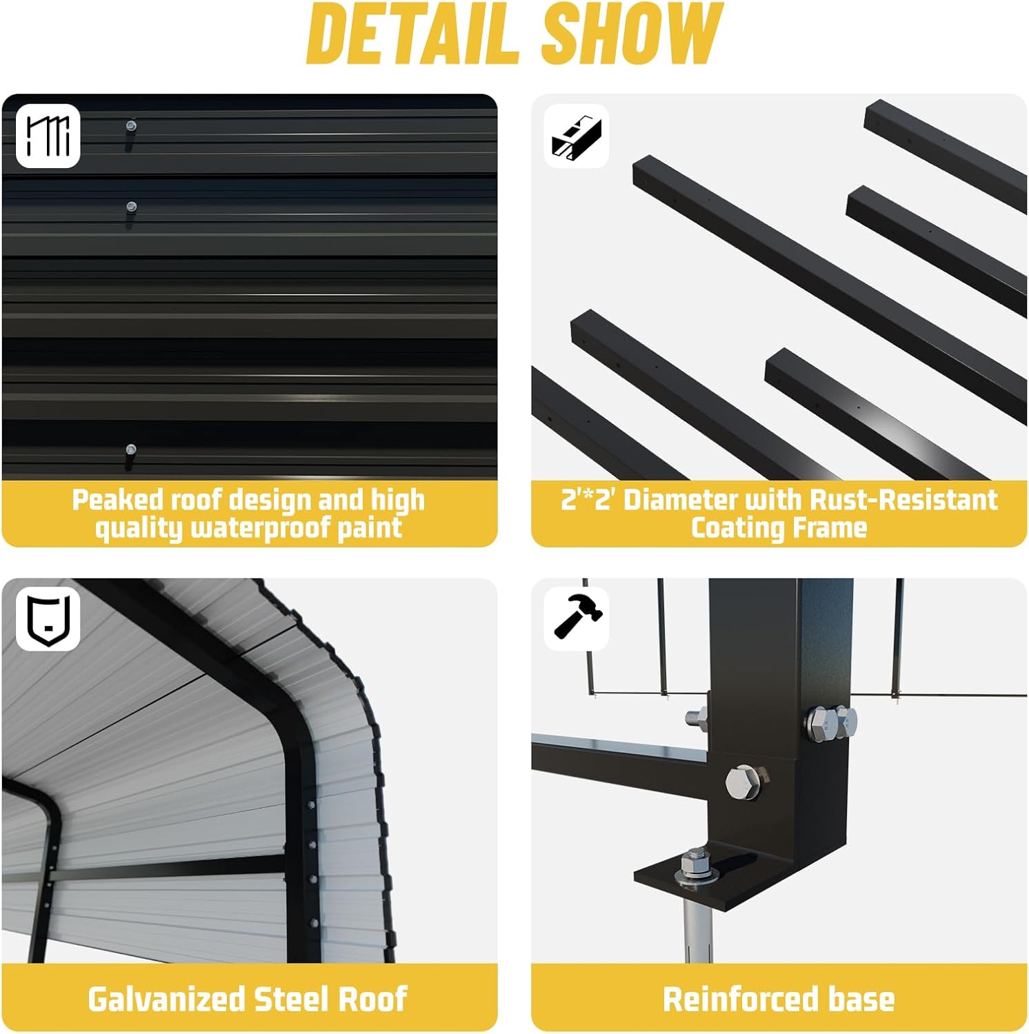 - Sturdy and durable: The metal carport is made of high quality galvanized steel and 2 "x 2" powder coated tube frame, carefully reinforced at key locations to ensure unmatched strength and flexibility, while also effectively preventing rust and maintaining the integrity of the exterior.The garage is designed to withstand rain, snow, wind and other weather conditions.Wind Rating: 100 MPH; Snow Load Capacity: 35 PSF