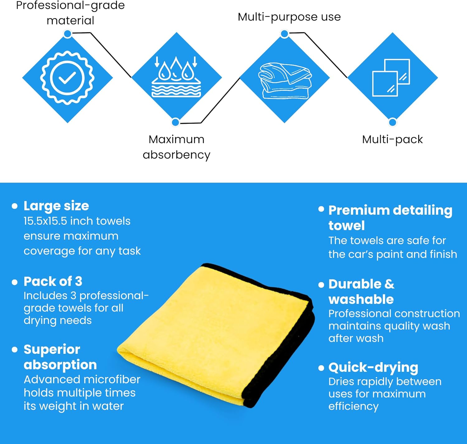 Microfiber Towels for Cars - 15.7" x 15.7" inches, Highly Absorbent Professional Grade Drying Towel Set for Superior Cleaning and Drying Performance - Car Drying & Kitchen Towel - Pack of 3