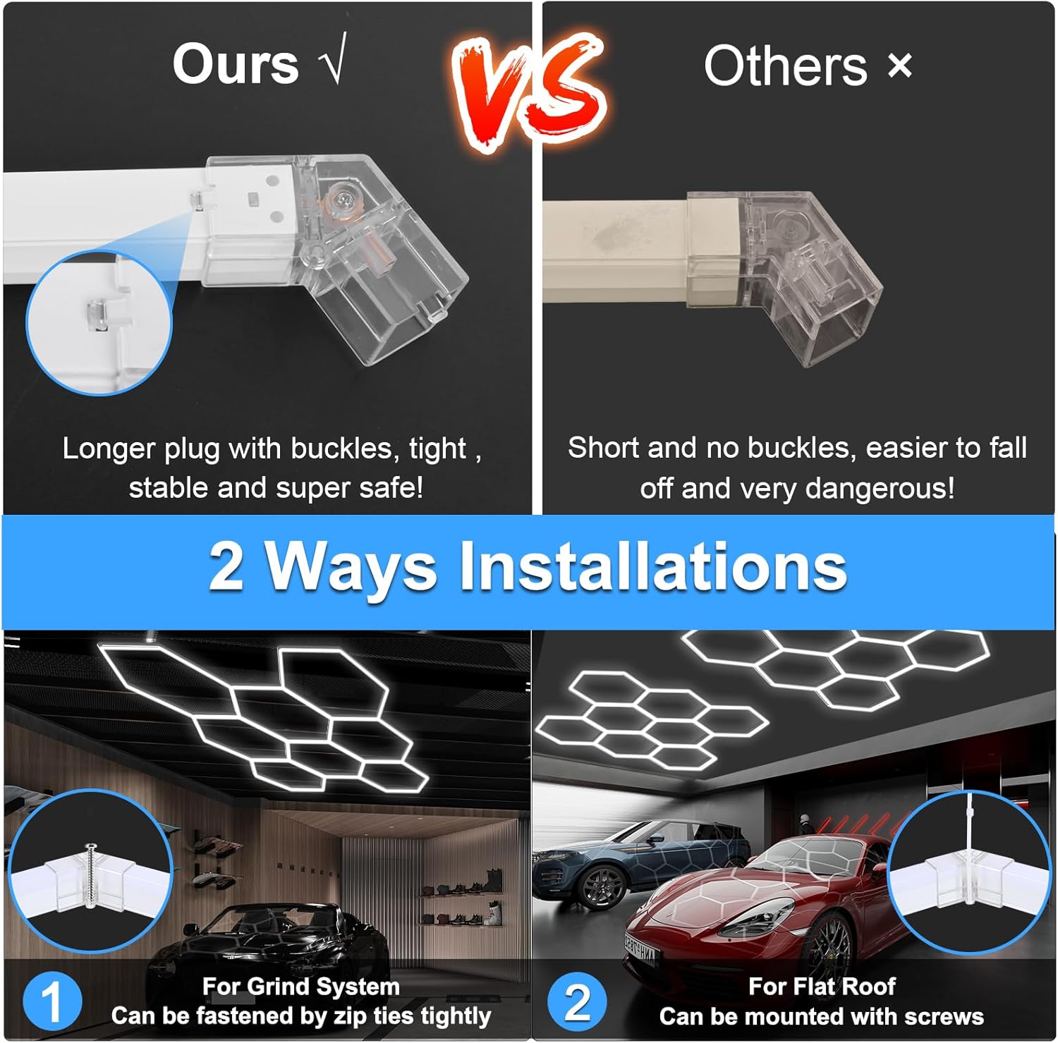 - Customization & Flexibility—Our hexagonal garage lights offer the versatility needed to create a personalized lighting configuration that aligns with your style and garage's layout. Equipped with adaptable V/Y connectors, you're empowered to combine multiple lights in various ways to achieve your ideal setup.