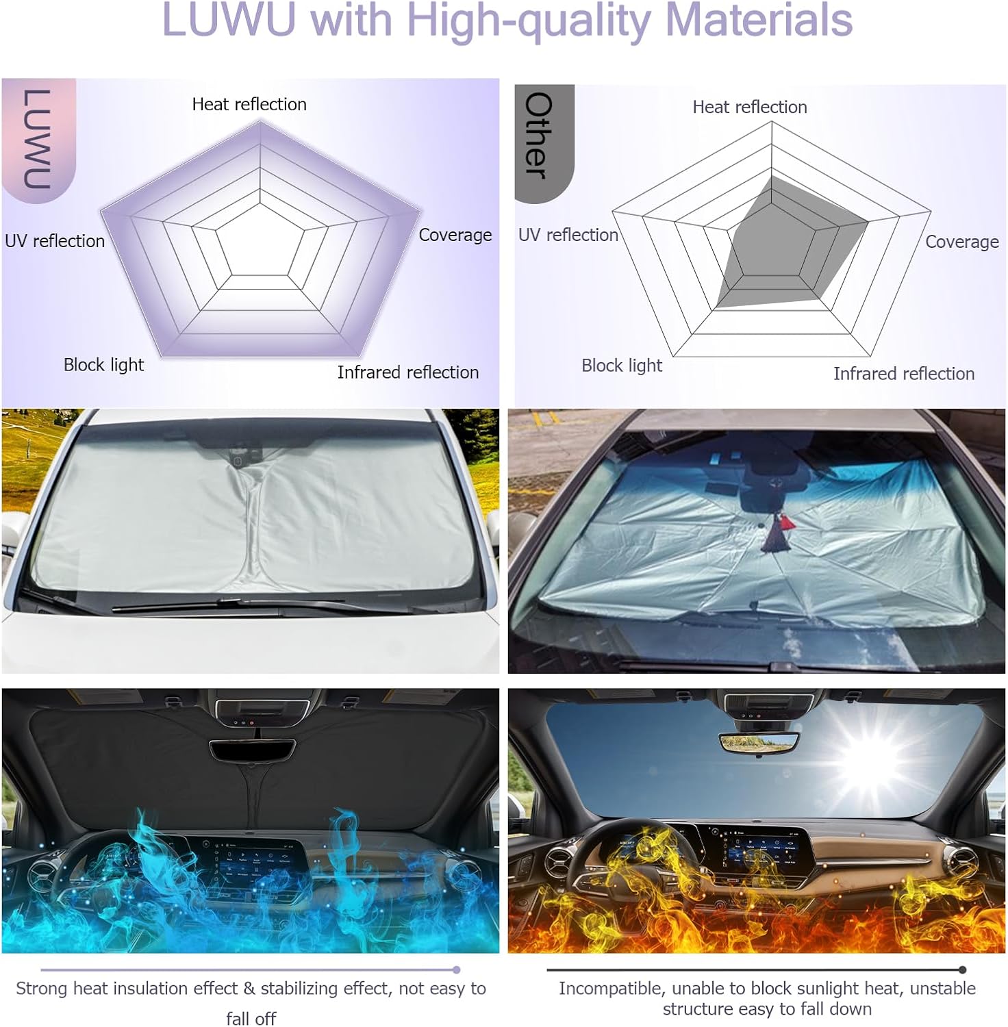 - 【Customized Design】 The front windshield sunshade is custom-made, effectively protecting your car from the sun's rays. The precise fit design and reinforced steel ring are sufficient to allow the sun shade to precisely fit the front window without the need for suction cups to hold it in place. Once installed it won't have gaps, sags or slumps like other car sun shade windshield