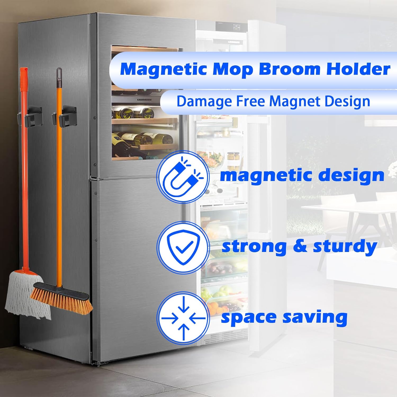 Strong Magnetic Mop Broom Holder, 2 Pack Heavy Duty Magnetic Mop Hanger for Refrigerators, Magnet Wall Mount Broom Holder Tool Storage for Laundry Room Garage Kitchen Workshops Metal Shed