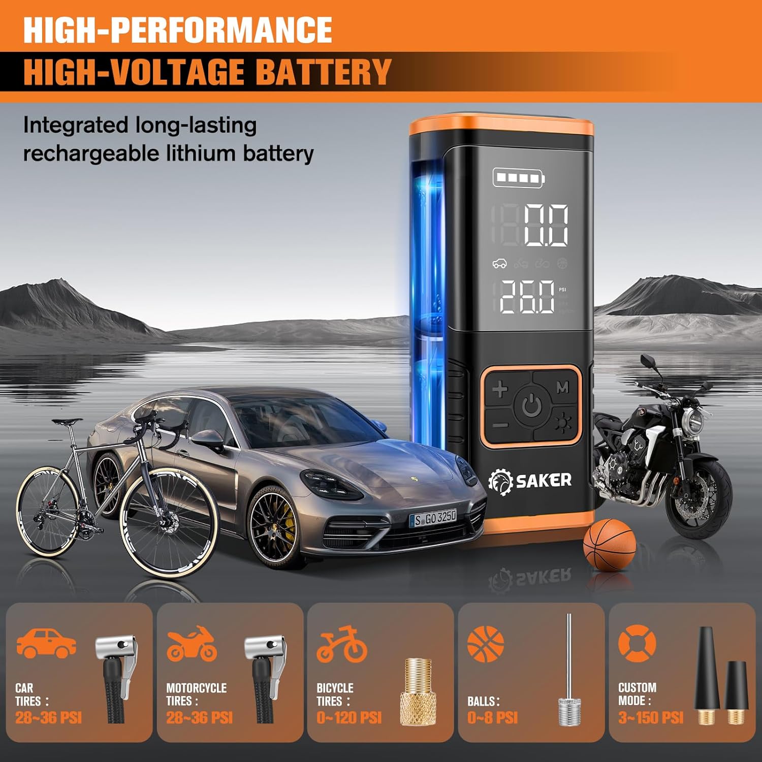 - 【EFFICIENT & FAST INFLATION WITH 150 PSI】Saker air compressor provides high-efficiency inflation with a maximum pressure of 150 PSI. It can inflate a 225-size tire from 0 to 36 PSI in 9 minutes under a full charge. This efficiency allows for rapid inflation, saving time and ensuring your items are ready to use in minutes. When fully charged, the saker tire inflator portable air compressor can inflate two and a half 225-size tires from 0 to 36 PSI.