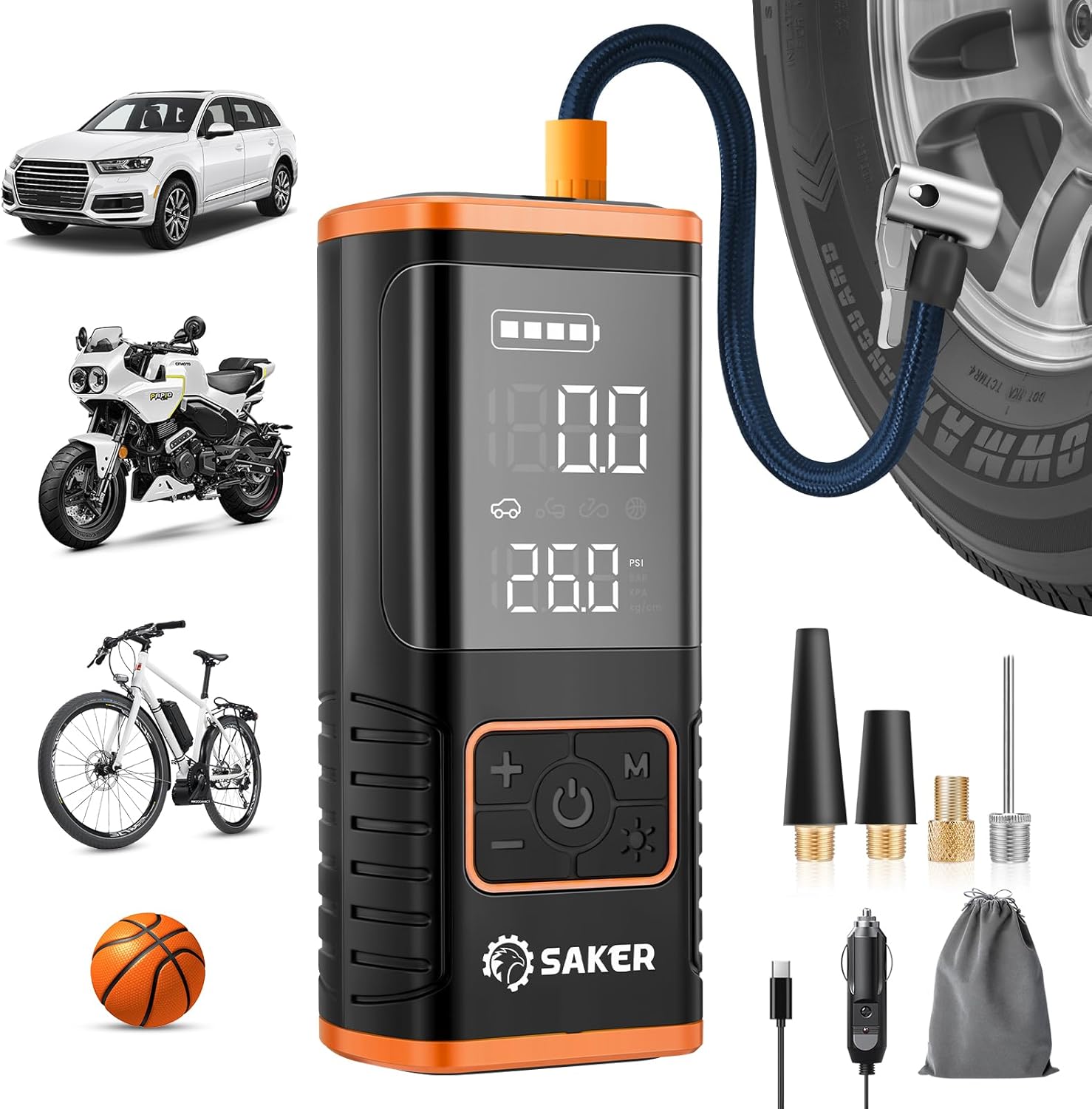 - 【VERSATILE POWER SUPPLY OPTIONS】Saker tire inflator comes with a built-in 7500mAh high-capacity battery that supports a 5V/2A USB-C charging port for convenient recharging. Additionally, it includes a 12V DC power cord, allowing the portable air compressor to be used with an external power source in case the battery is depleted, ensuring you are never without power on the go.
