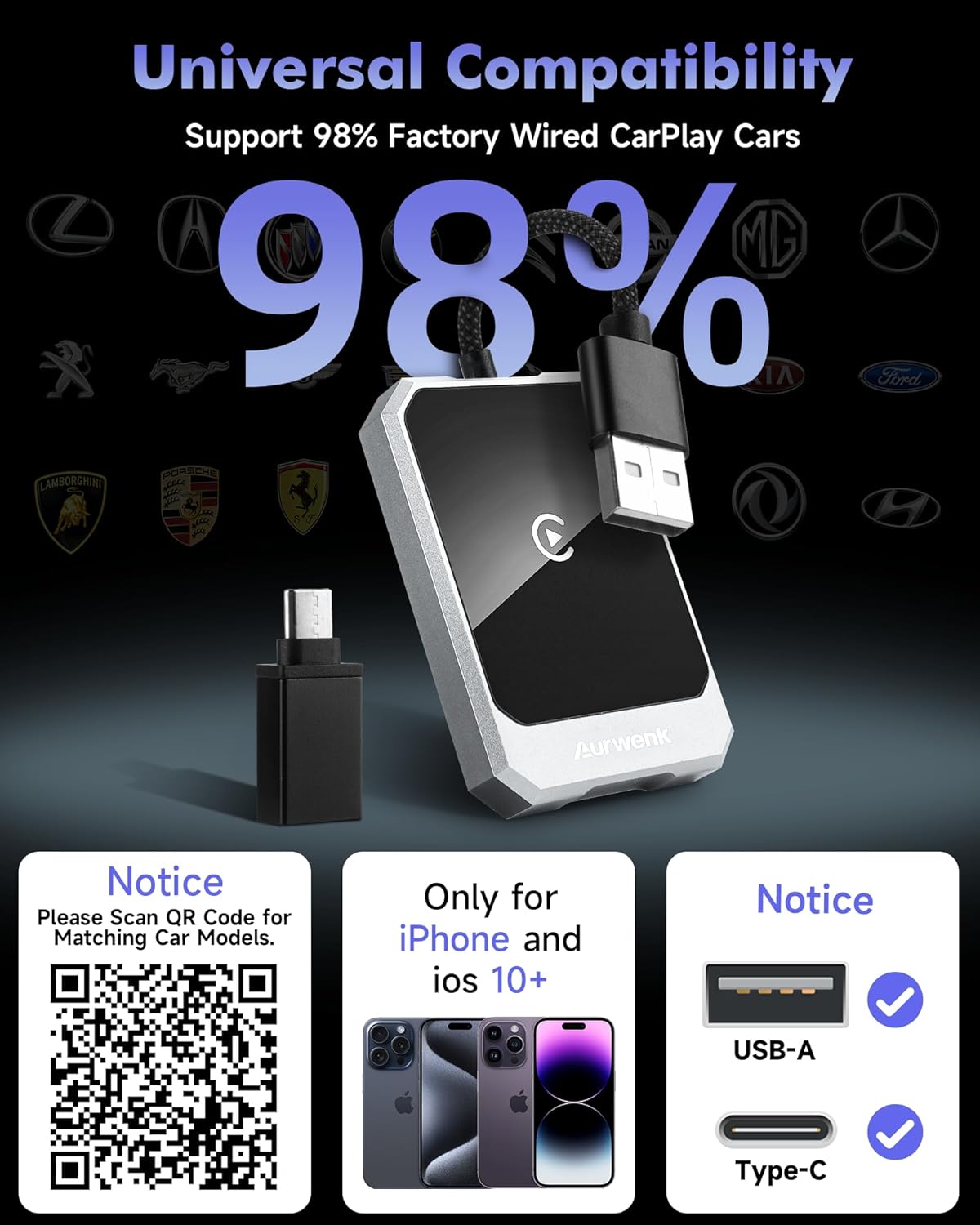 - Wide Compatibility: Our carplay wireless adapter is compatible with a wide range of vehicles and iPhone with IOS 10 or above, ensuring a versatile solution for different car makes and models.