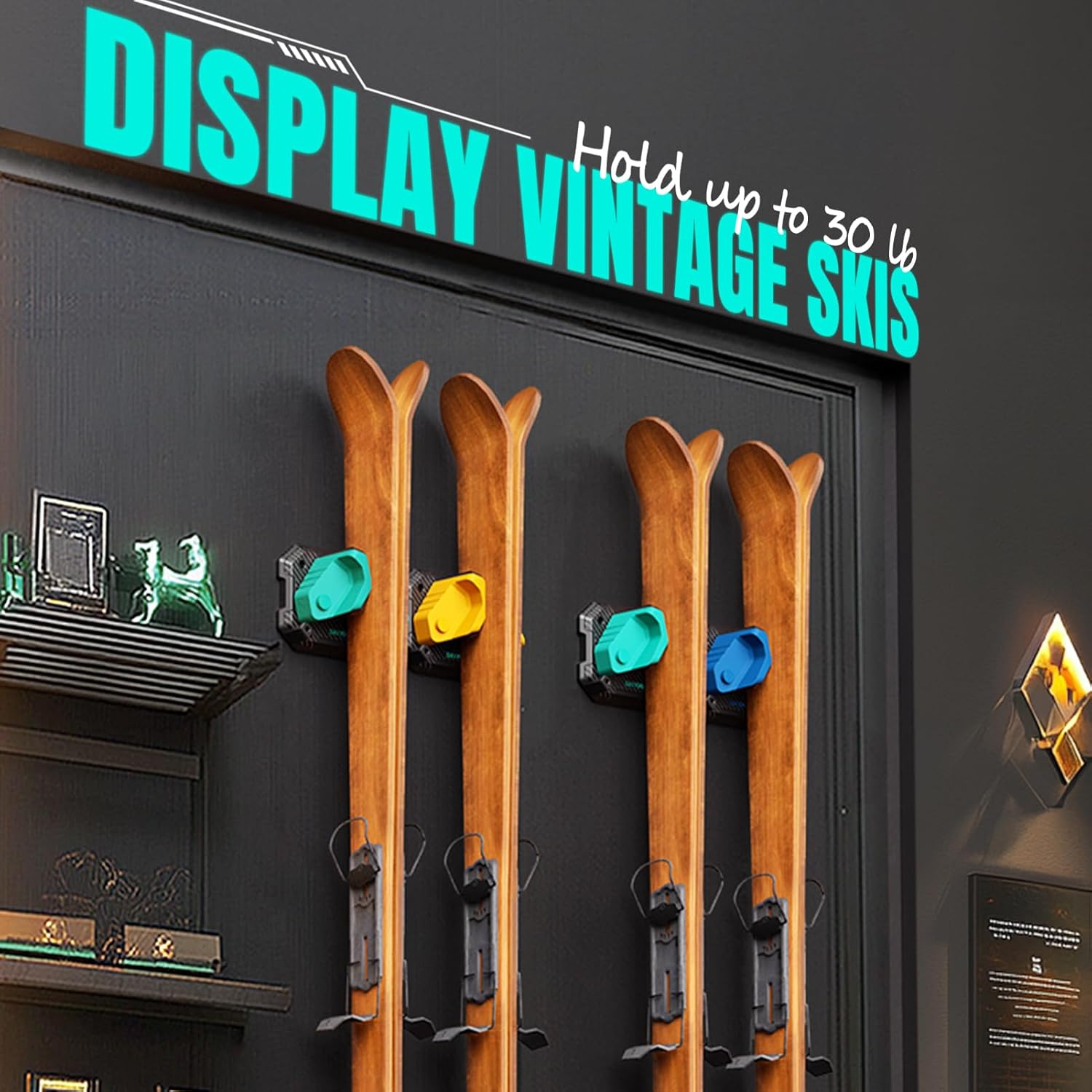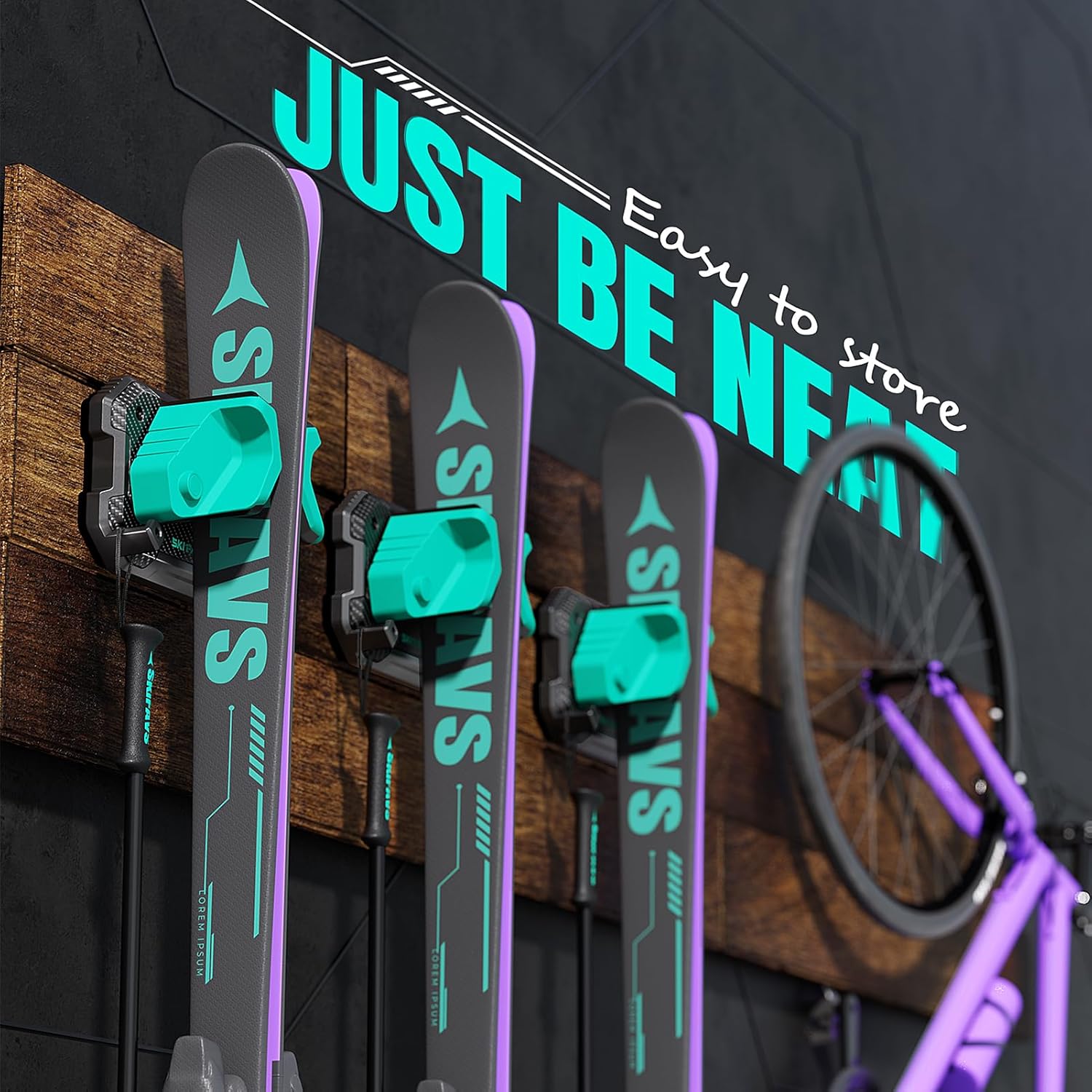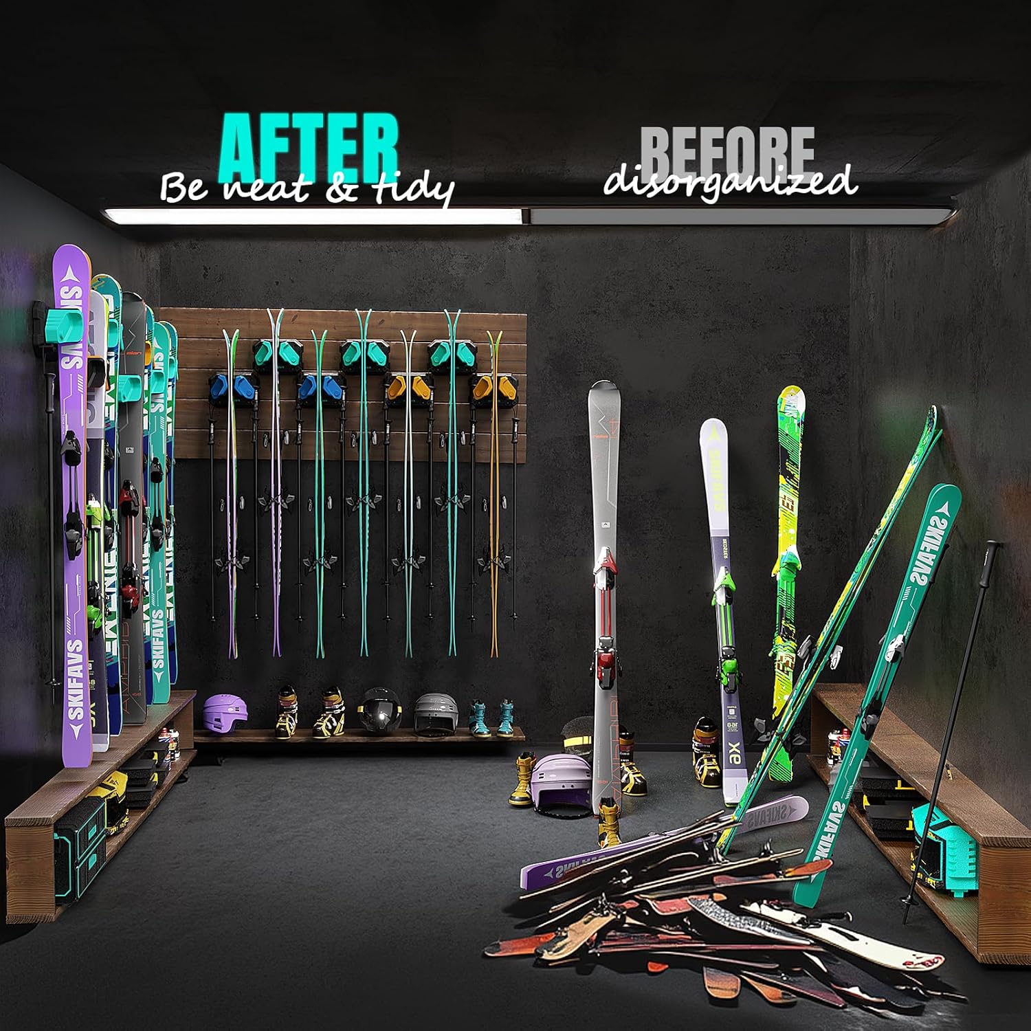 - Versatile and Stylish: Our ski holder isn't limited to just skis. It can accommodate any skis, snowboards and skateboards. Its multifunctional design also allows you to hang brooms, sleds, and other tools. With its staggered arrangement, our ski wall mount not only provides efficient storage but also adds a touch of elegance to your room, transforming it into a stylish winter sports haven.