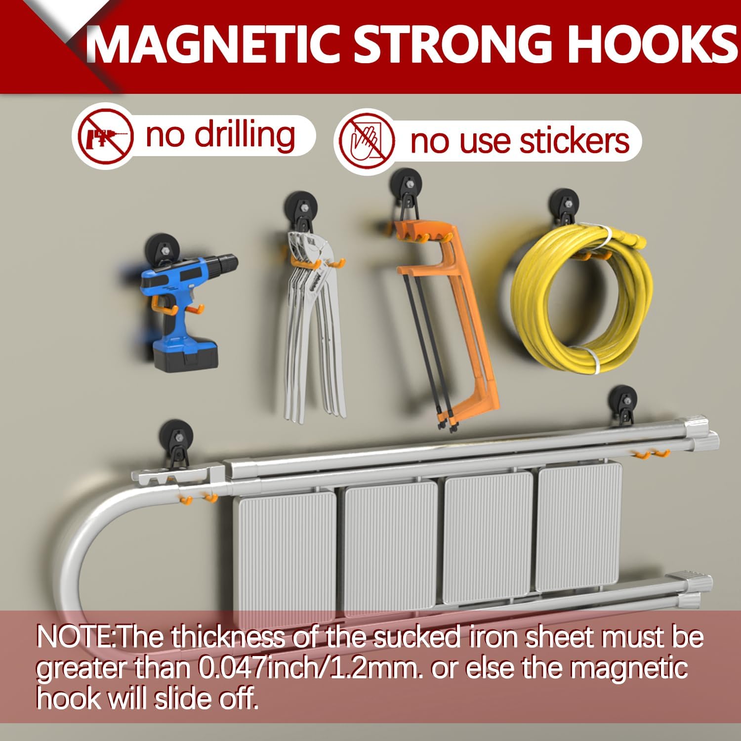 - Efficient Vertical Storage Solution: Discover the ultimate space-saving solution with our strong magnetic hooks. Versatile and reliable, these hooks are perfect for a multitude of environments, including garages, kitchens, offices, warehouses, gardens, and basements. These magnet hooks heavy duty help to reduce clutter and maximize available space, accommodating a variety of tools and equipment, including hoses, ropes, shovels, wires, cables, rakes, and more