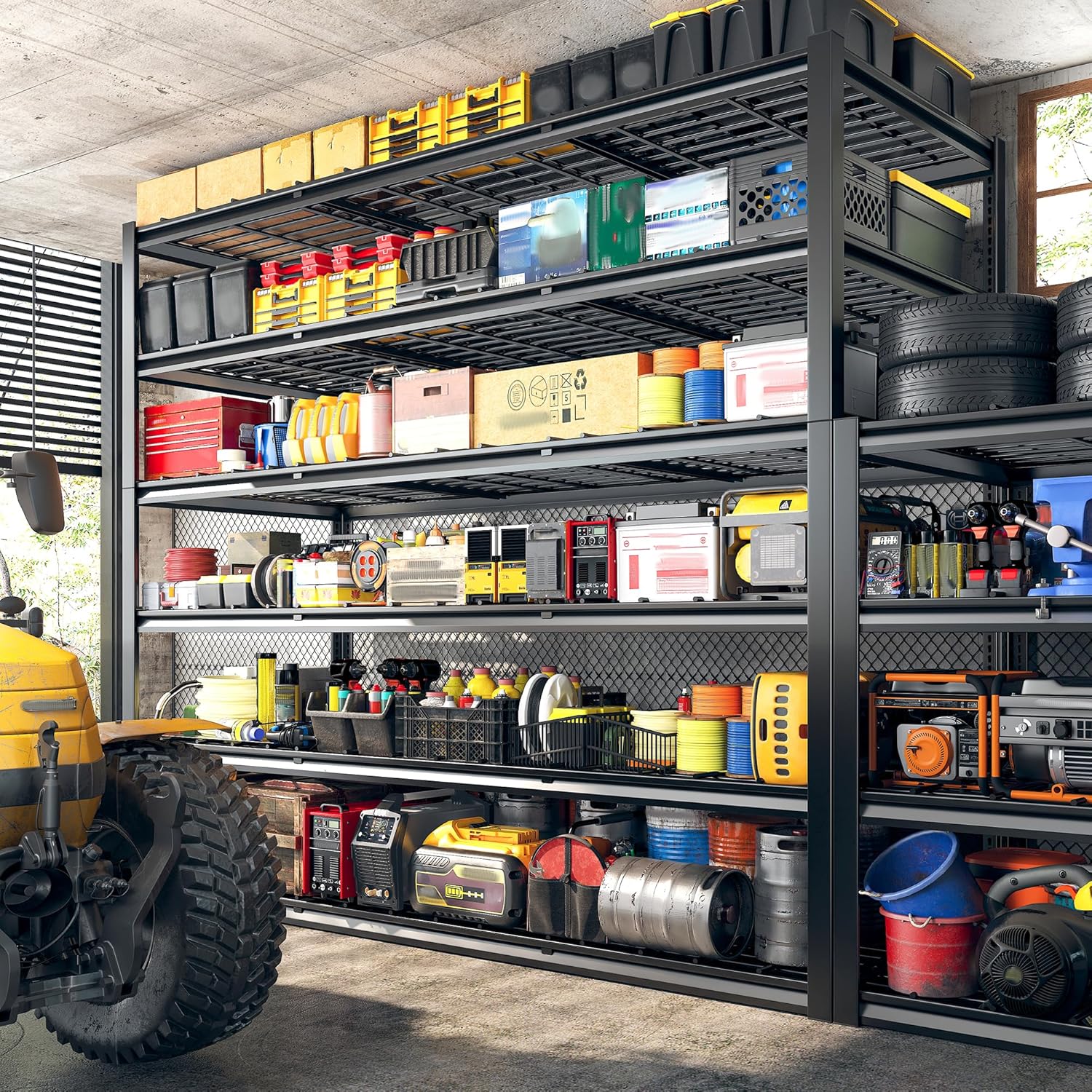 - ă2900LBS Heavy Duty ShelvingăThe combination of thickened metal mesh of wire shelving and double-layer metal shelves of columns gives the all metal shelves for storage an ultra-high load-bearing capacity of 2900LBS, please rest assured to store heavy items on the garage storage shelves such as toolboxes, vehicle parts, files, dumbbells, office supplies, etc