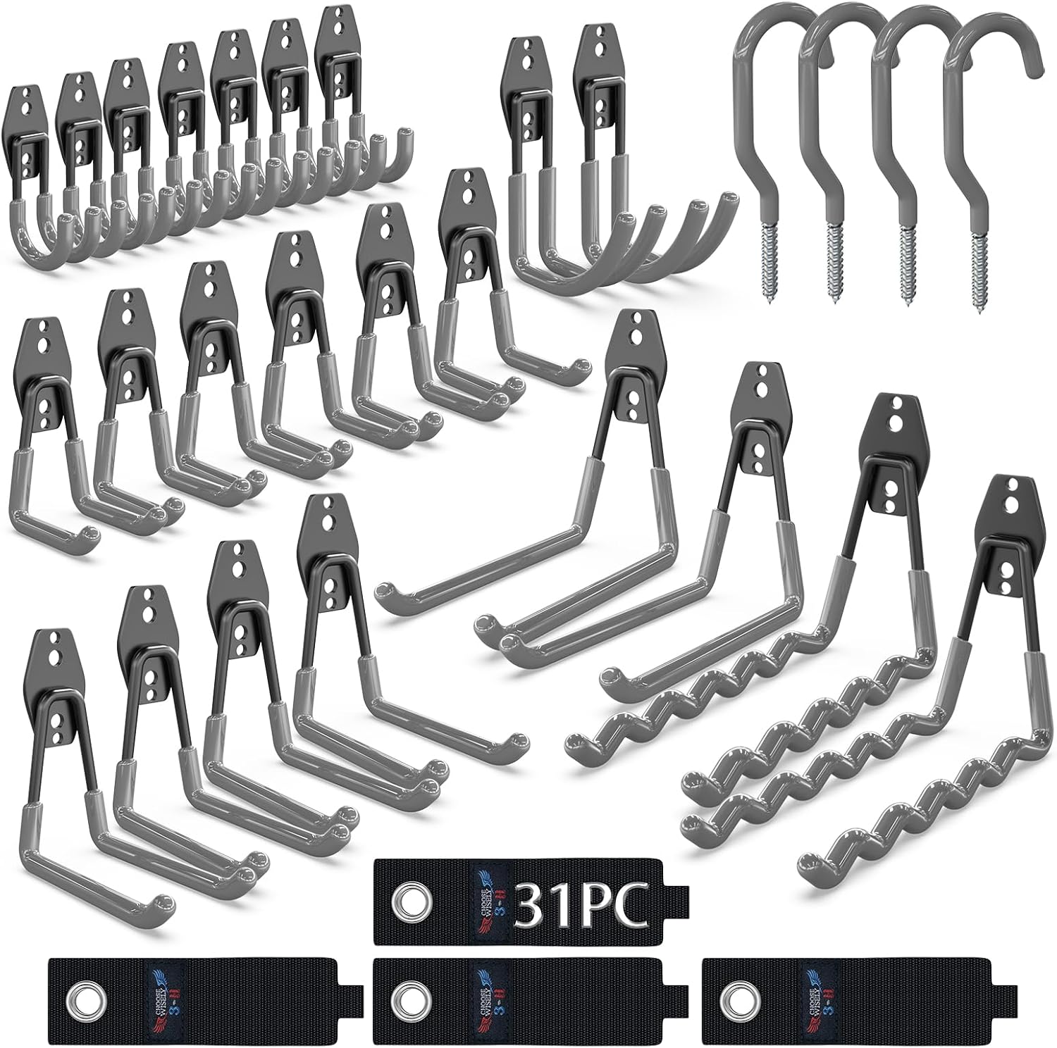 - 31-Pack Contains 6 Types Hooks: There are 23pcs ladder hooks for garage in 6 different sizes: 2 wave tool hangers, 2 large square type bike hooks, 4 medium square type ladder hooks for garage wall, 6 small square type garage hangers, 2 medium J type garage wall hooks, 7 small J type storage hooks for hanging in garage and 4 storage straps in sizes: 50*330MM, 4 Wall Mount screw Ceiling Hooks - Hanger for organizing bikes, ladder