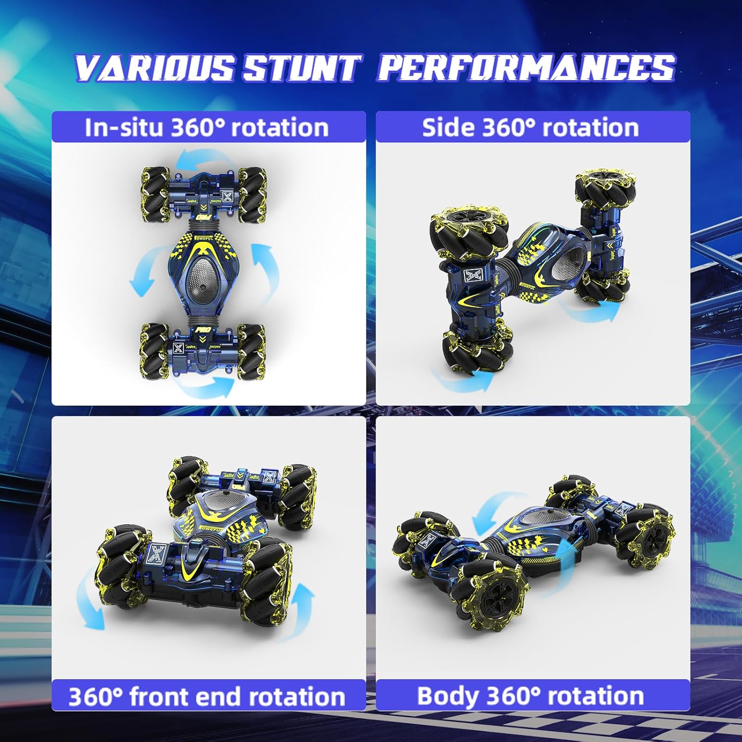 - RC Stunt Car Quality Assurance:The car Equipped powerful 4WDwith anti-collision durable rubber tires and shock absorbers and with flexible wheels, the race toy car allows high speed and better flexibility. Suitable for competitions on all kinds of ground,such as grass, desert, rocks, stairs, rough roads, etc, will bring your kids a different driving experience.