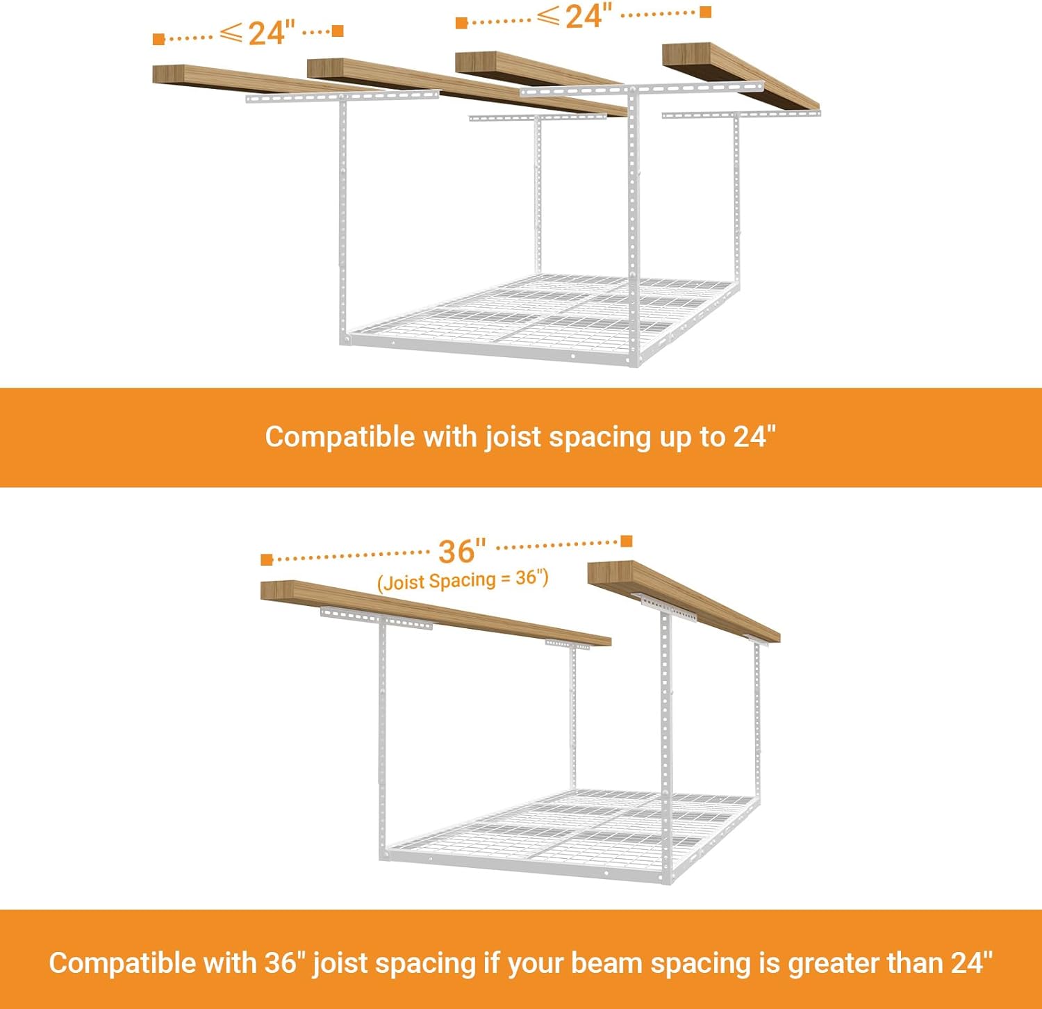 - Compatibility: It's compatible with joist spacing of ≤24 inches. If the ceiling joist spacing is greater than 24 inches, it is only compatible with 36 inches of ceiling joist spacing. Also it's compatible with ceiling angles under 15 degrees.