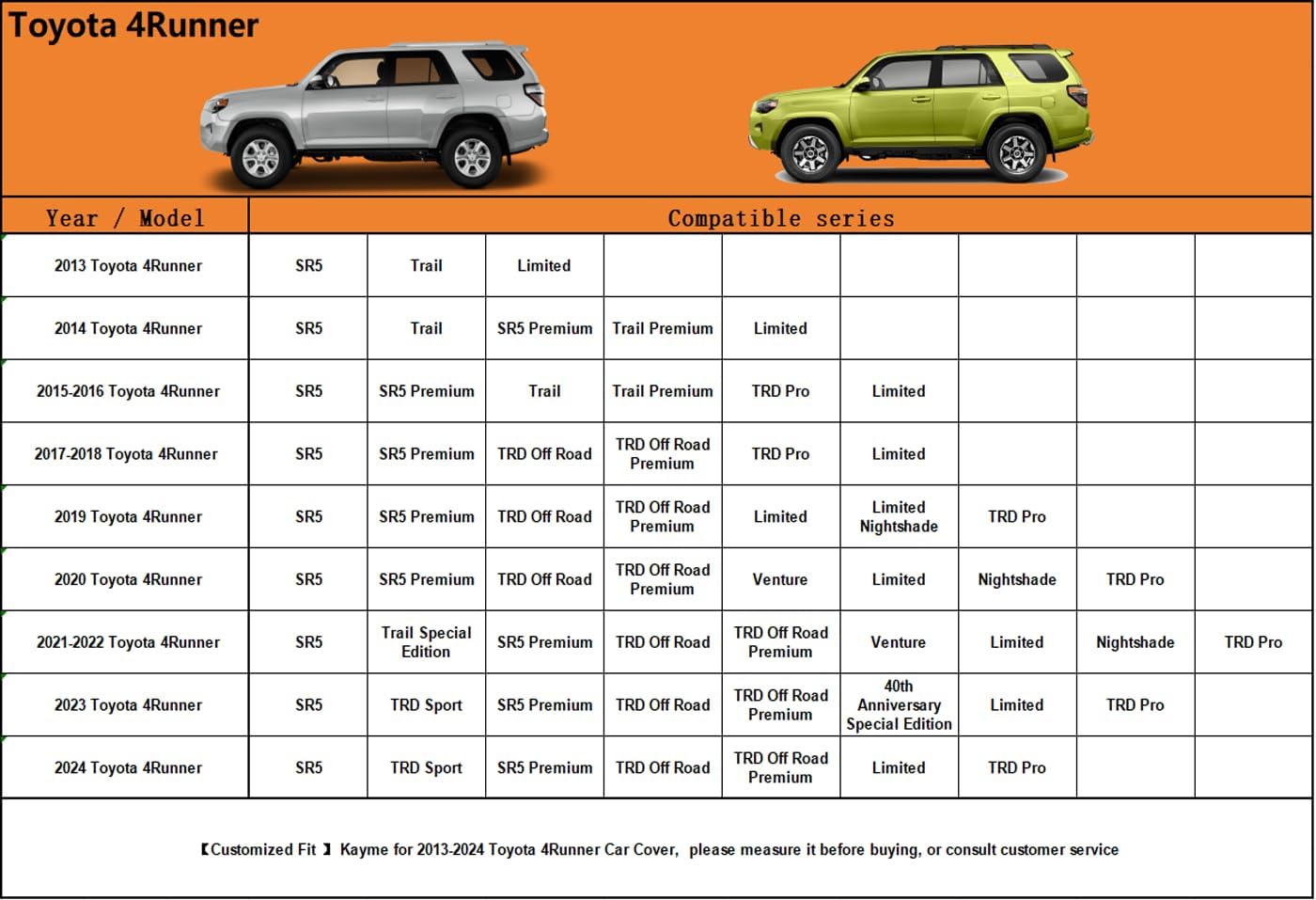 - Coverage : Full exterior coverage for Toyota 4Runner SUV