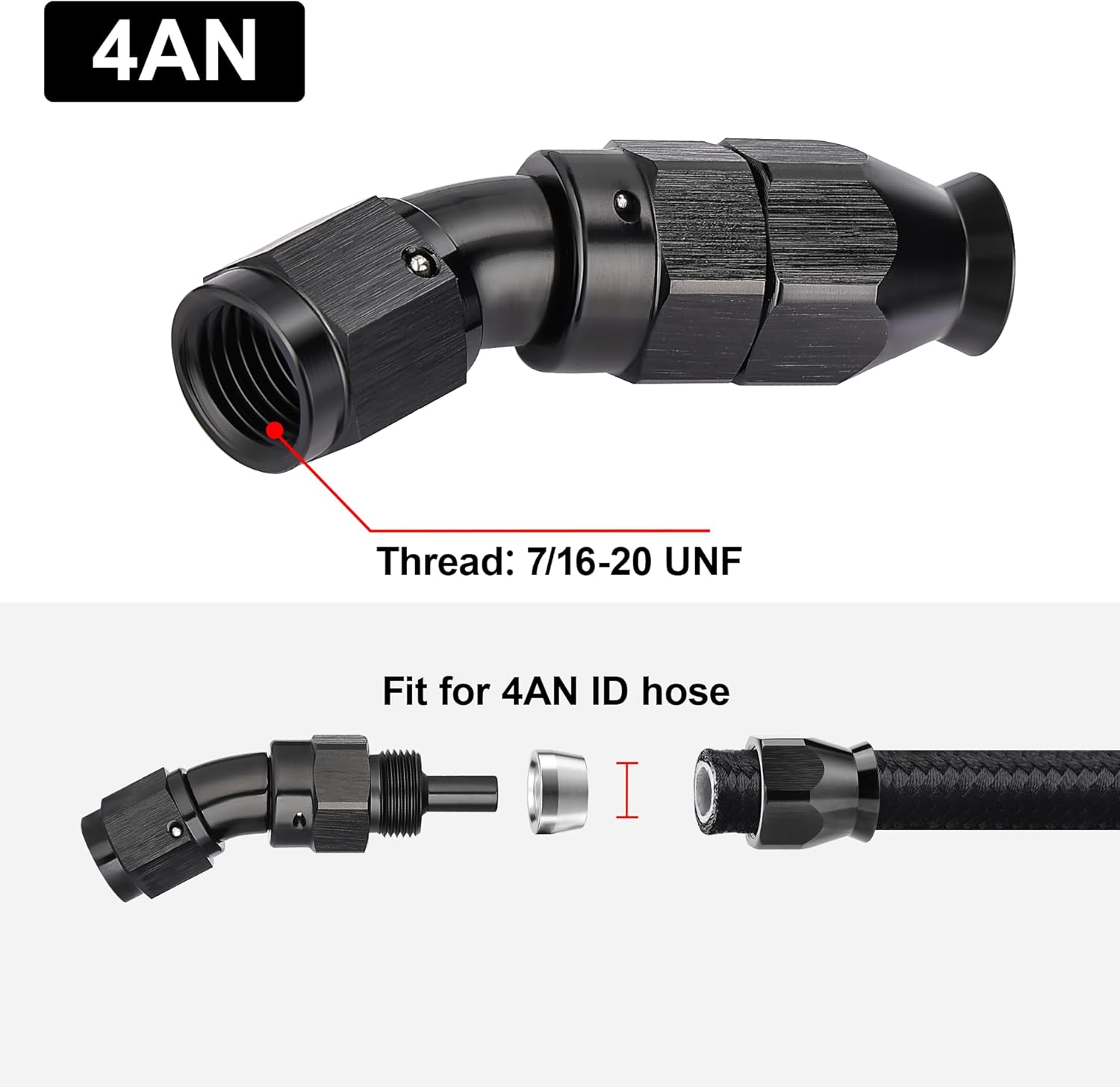 - [Application] These fittings are ONLY used with PTFE fuel lines for E85, alcohol, nitro, clutch, nitrous, power steering, oiling, hydraulics, and vacuum applications. A 360° swivel design allows for easy assembly.