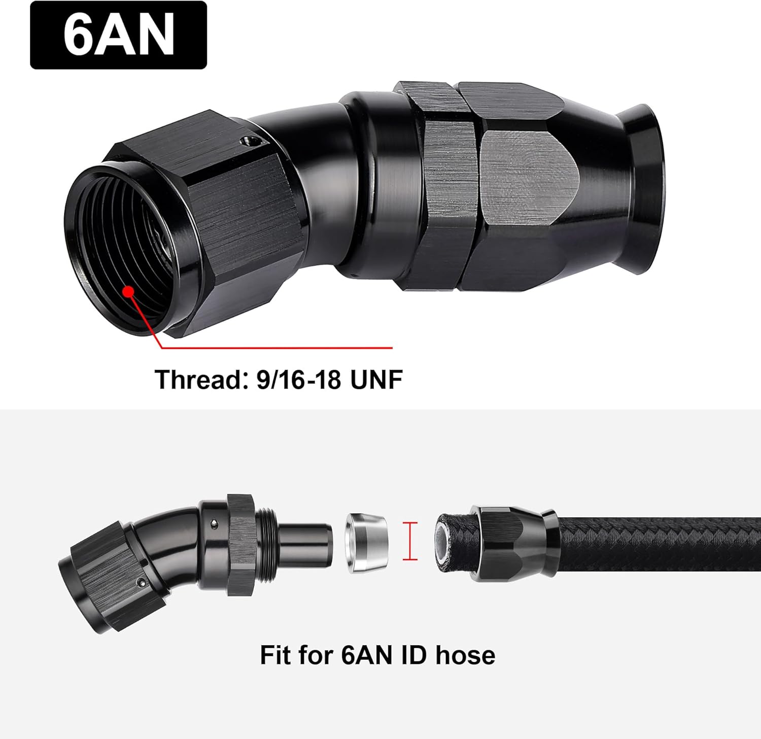 - [Product Size & Parameter] Size: 6AN. Thread Size: 9/16-18 UNF. Working Pressure: 1500PSI. Working Temperature Range: -40°F-250°F. Angle: 30 Degrees. Note: Please verify the hose size before purchase.