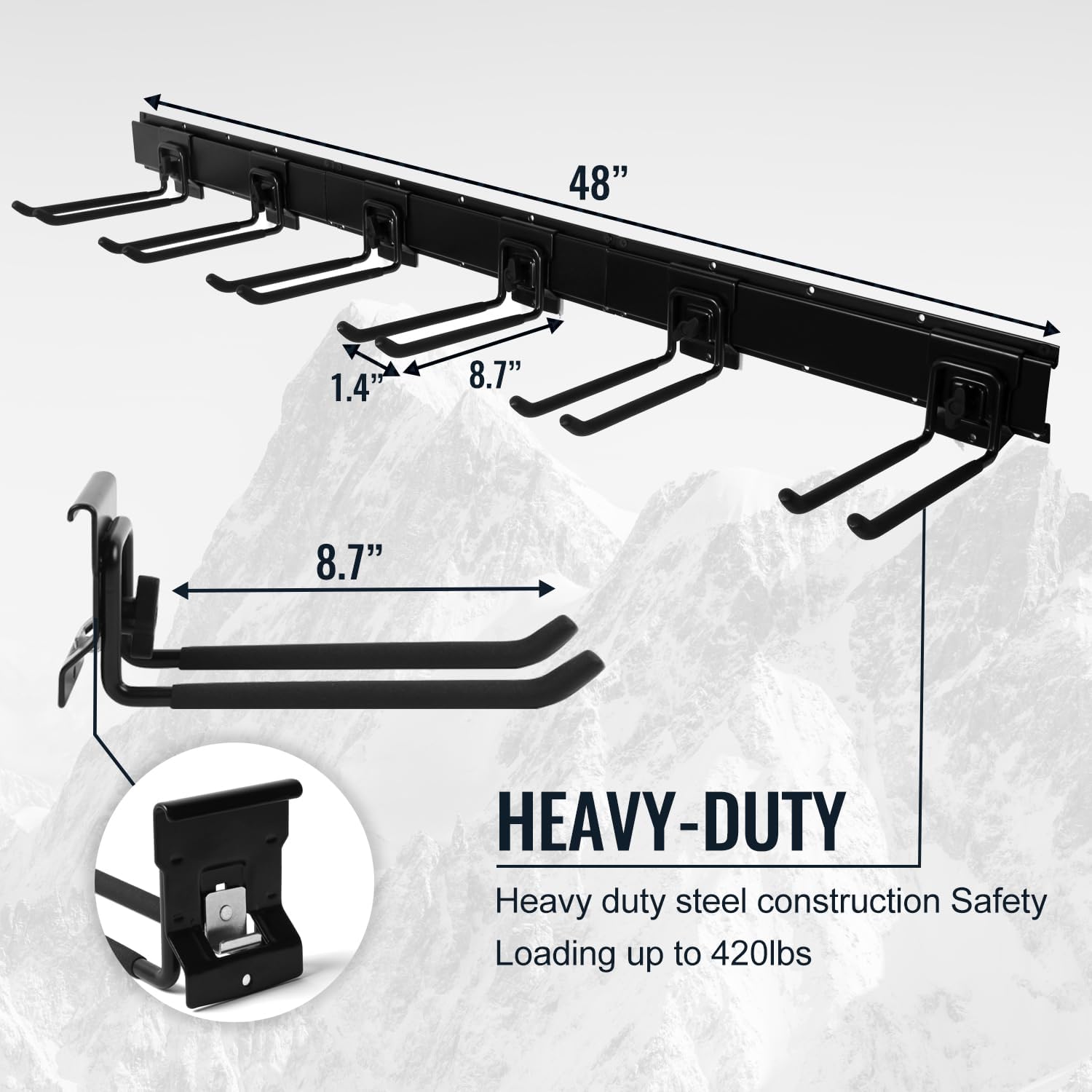 - HEAVY DUTY STEEL CONSTRUCTION: Crafted from industrial-grade steel, our garage tool hanger is incredibly durable, supporting up to 300 pounds—perfect for heavy garden tools. These heavy-duty garage hooks are designed to last and handle your toughest tools