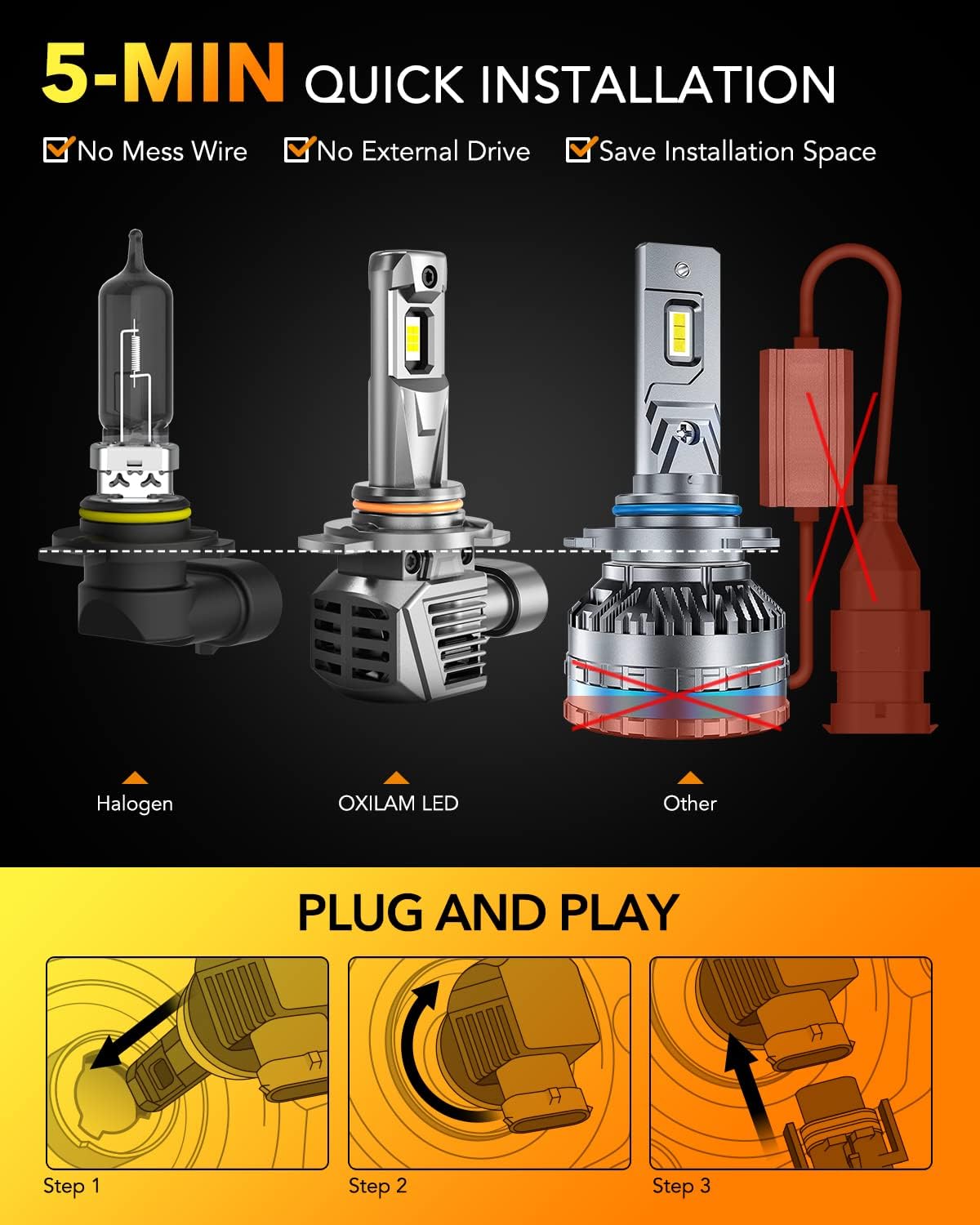 - 【5-MIN Quick Installation】: OXILAM9012 bulbs adopt a direct plug-in and wireless design, 1:1 size close to the original bulbs without external driver and connector. Non-polarity socket, make the bulbs plug and play like halogen bulbs. Smaller in size than similar light, more space-saving, and easier to install.