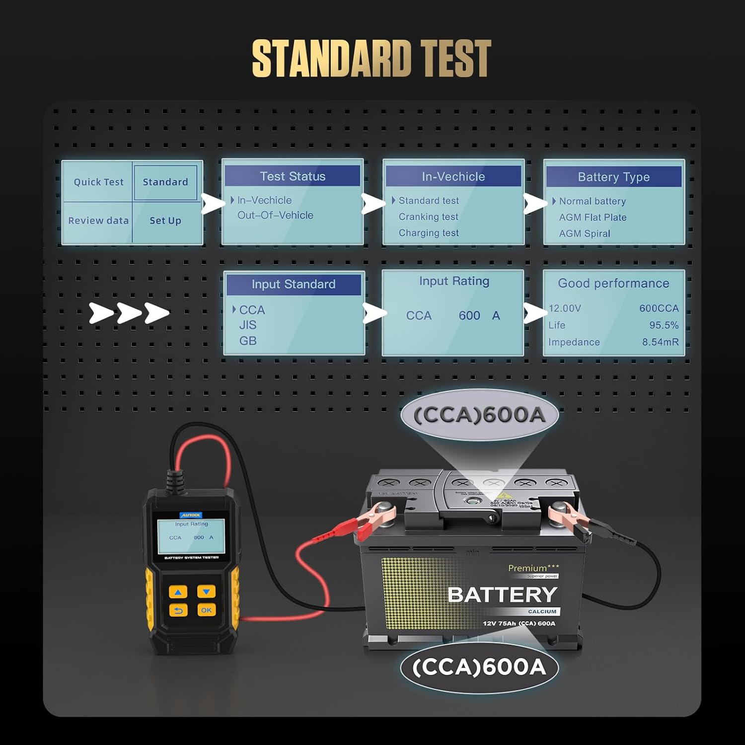 - 【Wide Compatibility】AUTOOL BT360 is the most cost-effective battery tester compared to other brands,with its quick test, battery test, cranking, and charging tests, it provides precise and quick assessments of battery health, voltage, and charge status, AUTOOL BT360 can test all 12V 20-2000CCA batteries flooded, AGM, GEL, EFB for cars, trucks, hybrids, SUVs, boats, RVs, and motorcycles. It complies with multiple standards (JIS, EN, DIN, SAE, CCA, BCI, GB, CA, MCA, and IEC), ensuring comprehensive testing for all requirements