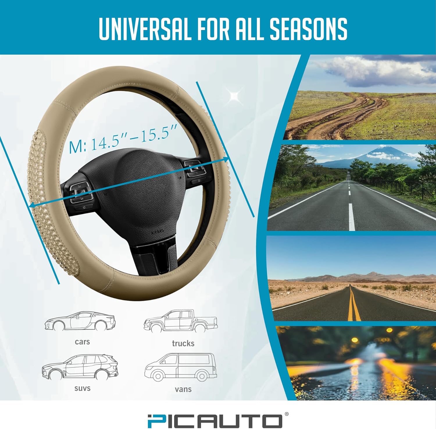 PIC AUTO Gel Particles Steering Wheel Cover, Beige Luxury Leather Car Steering Wheel Protector, Universal Fit 14.5"-15.5" Anti-Slip Car Interior Accessories for Girls & Women