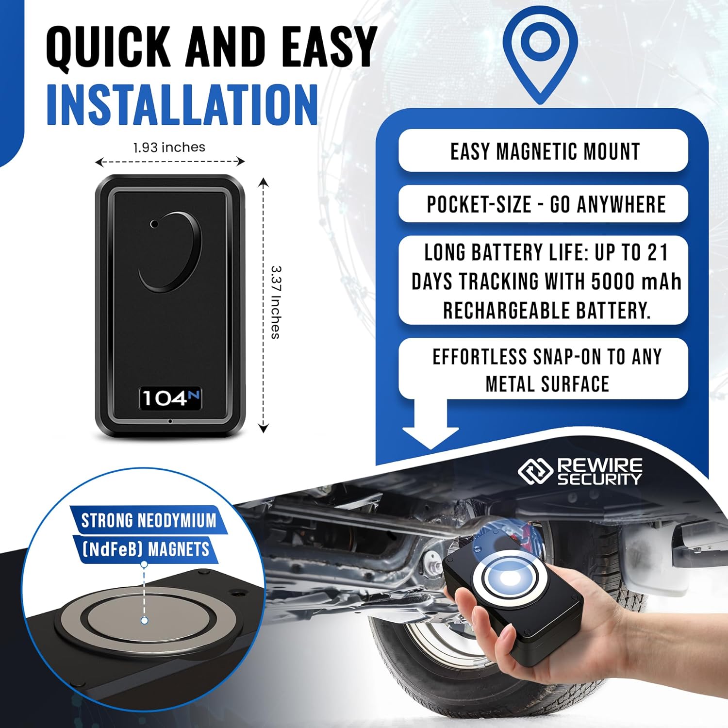 REWIRE SECURITY 104N 4G Magnetic GPS Tracker for Vehicle | Easy Mount | Fits with Car, Truck, Van & Motorbike | Portable Live Tracking | Up to 21-Day Battery Life | Low Cost Subscription Plans