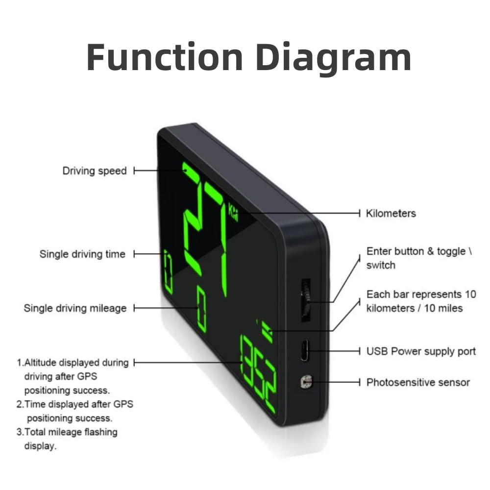 - 【9-in-1 HUD】Heads up display, it has multifunctions - Vehicle driving speed, Driving time, Driving mileage, Total mileage, Over-speed alarm, Fatigue driving warning, Local time, Altitude, freely switch between kilometers and miles.