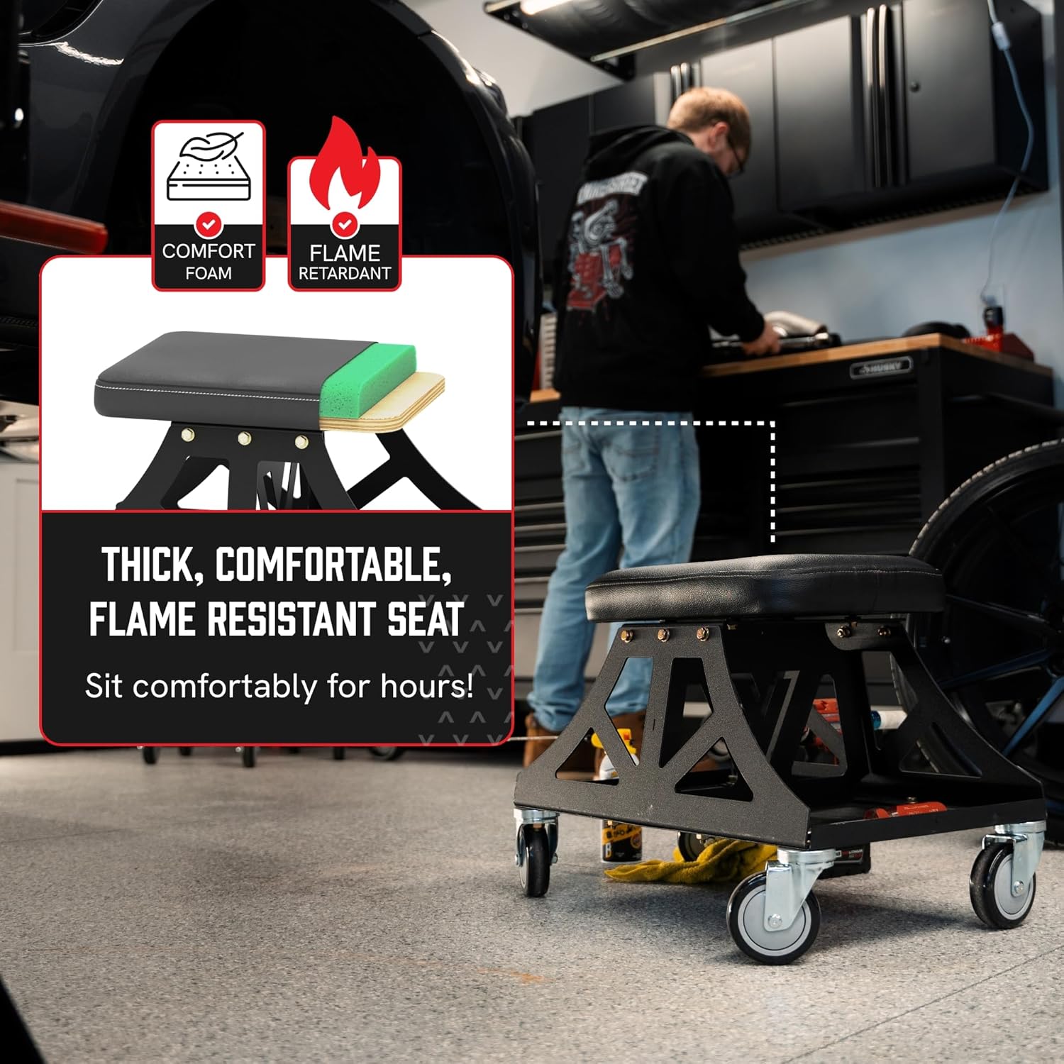 - Comfortable, removable seat – The Vyper Low Pro garage stool has a thick foam seat that can be easily removed and used as a knee/rest pad for lower, hard-to-reach areas, supporting your back and knees.