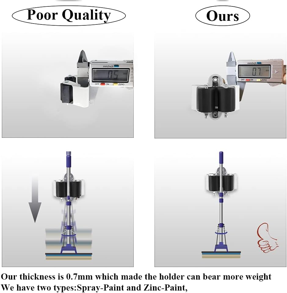 - EASY TO USE: Because mop broom holder wall mounted is made of 0.7mm thick metal material instead of 0.5mm as most of the ones on the market, you don’t have to worry about deformation even if you use it indoors or outdoors for a long time.You can slide the broom in and out with one hand. Unlike plastic mop holders with spring-loaded rollers, this broom organizer wall mount has rubber rollers to hold the handles, allowing the handle to slide in from the front and be held firmly in place.