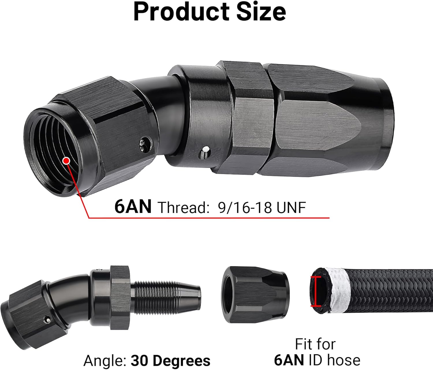 - Size: The thread size of 6AN is 9/16-18 UNF. The AN side is sealed by a 37 degree angle
