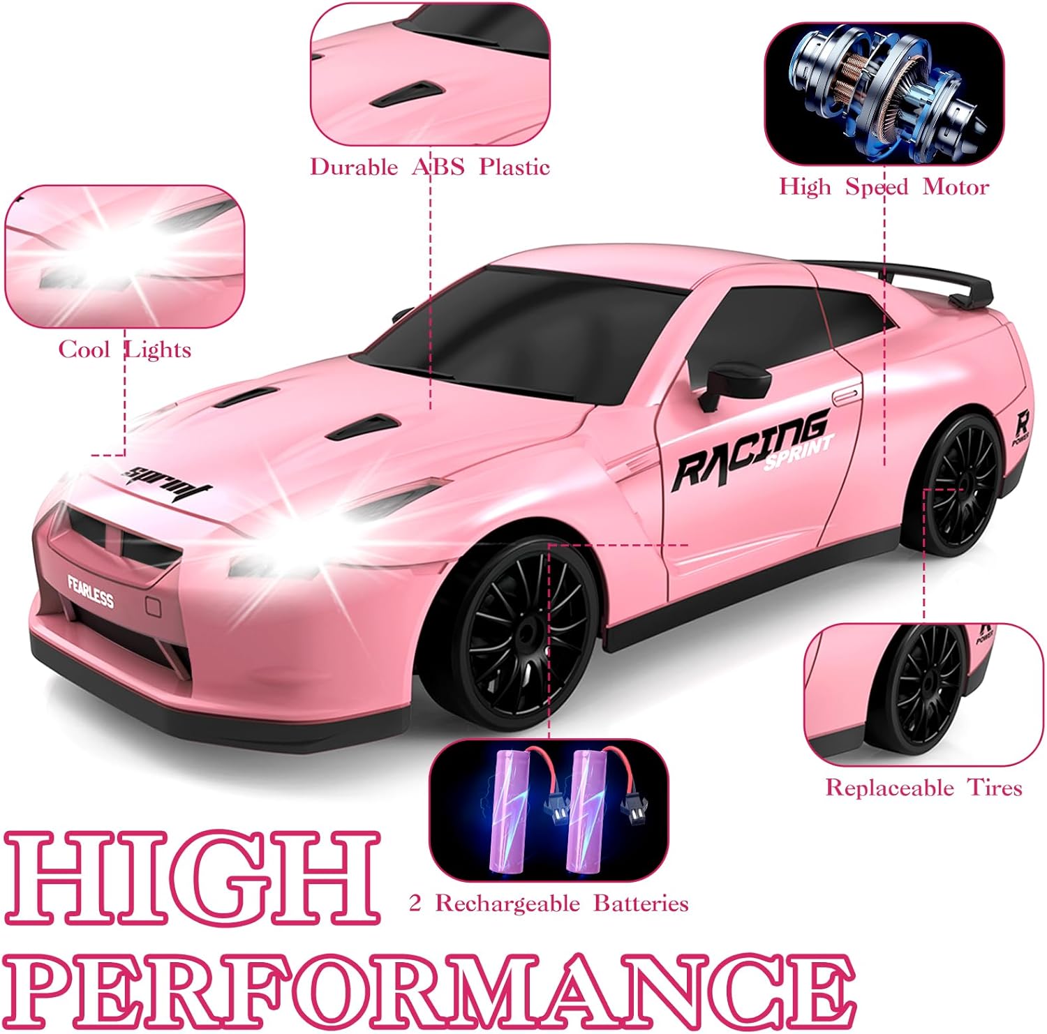 RC Drift Car, 1/24 Pink Remote Control Car for Girls, 2.4GHz 4WD High Speed Drifting RC Cars with LED Light, Two Batteries and Drift Tires, Racing Toy Cars for Kids Adults Girl Boys, Pink