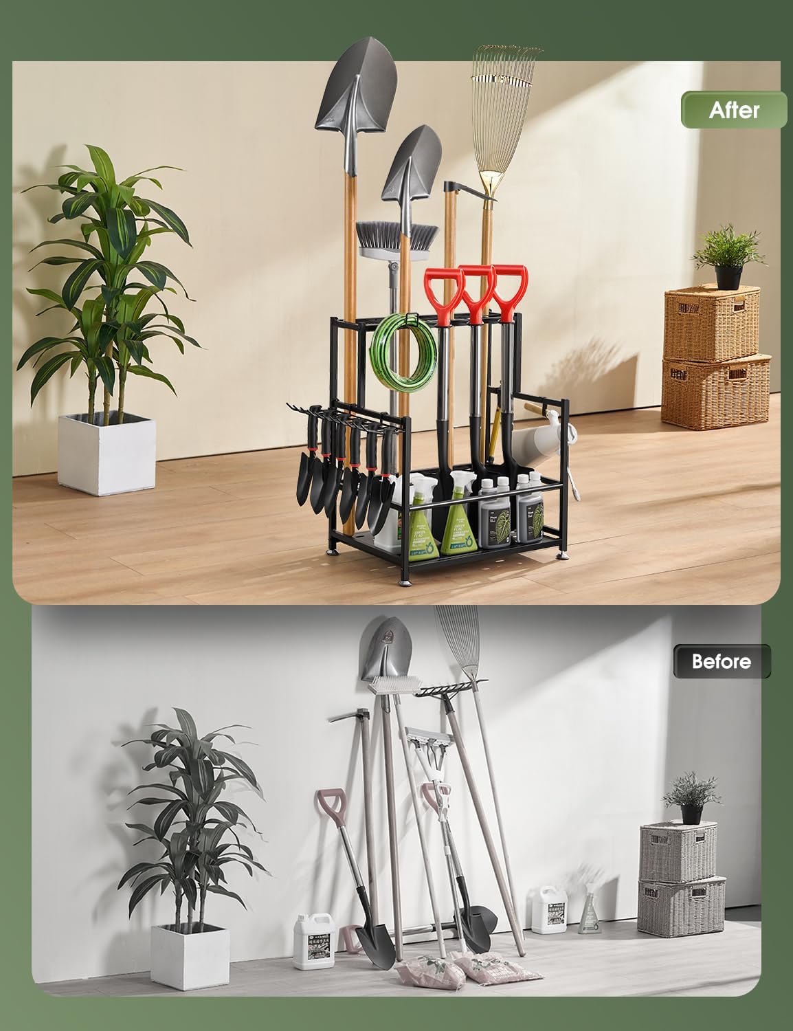 - Versatile Storage for Multiple Tools: This organizer is built to accommodate a wide range of tools—rakes, shovels, hoes, brooms, hoses, and more. You can also store smaller items like hand tools or gardening accessories, keeping everything neatly sorted.