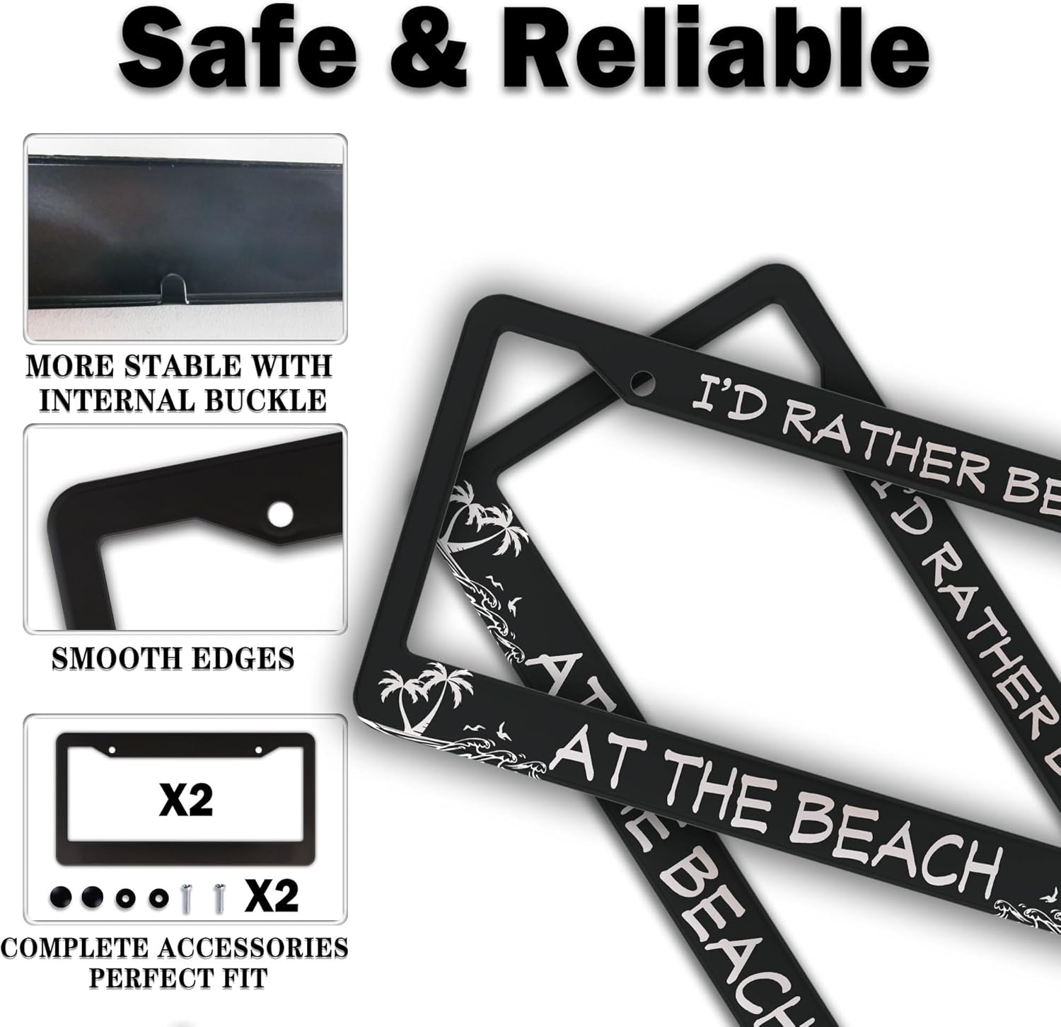 License Plate Frames Black and White License Plate Covers I'd Rather Be at The Beach Aluminum Metal Car Accessory 2 Pack with Screw Covers Set